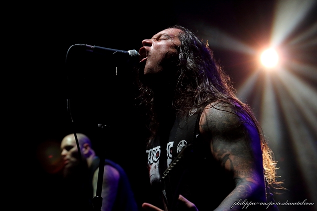 Nous revoilà dans la salle, le public est plus nombreux, pas mal de fans portent des t-shirt à l'éfigie d'Ektomorf. J'espère que les Hongrois feront mieux que leurs prédécesseurs. Ils attaquent leur set avec Agressor qui est aussi le titre de leur dernier album. Ah, ça a un peu plus de couilles, la musique jouée est très inspirée de la Cavalera family, on ressent des influences prises à Soufly et Sepultura. Ce groupe a été créé en 1994 par Zoli Farkas (chant/guitare) qui a un sacré charisme, le bougre. Il chante pas mal aussi.
