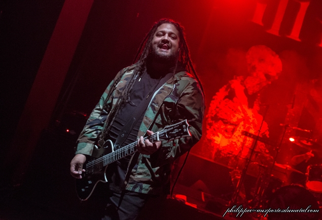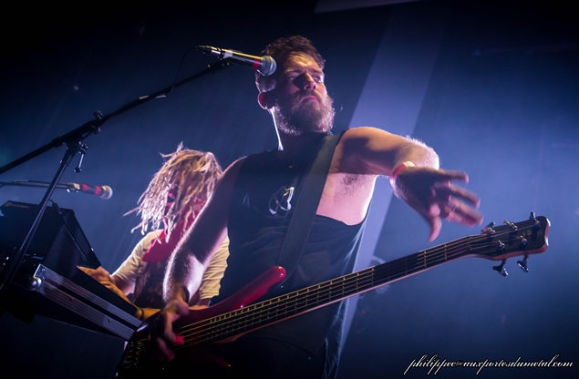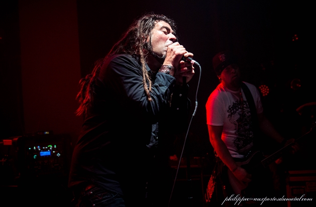 Après cette belle branlée, on va pouvoir respirer car une bonne partie du matériel cette fois-ci va déménager, on va bénificier d'un véritable entracte, la salle se vide. Beaucoup ne reviendront pas. Le public est parsemé à l'entrée de Xtortya, un groupe australien qui mélange Hip Hop et Metal. Les musiciens sont bons (surtout le batteur et le bassiste) mais sur les parties rappées, la musique ralentit trop et l'ambiance a du mal à monter. Je m'ennuie assez rapidement et, après quelques photos, je sors prolonger mon entracte.