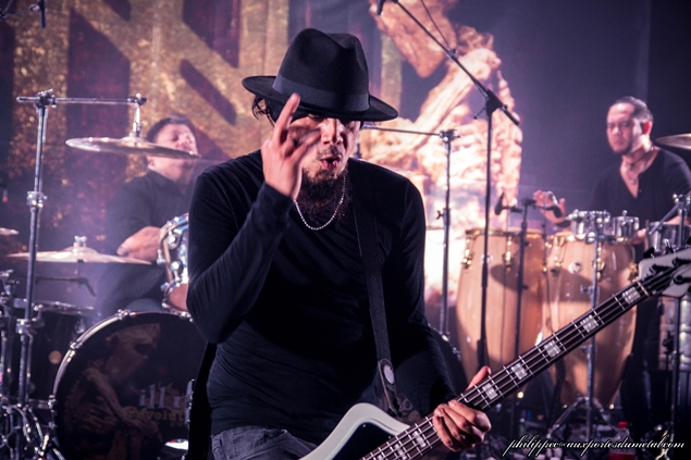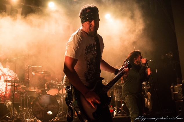 Il est près de 23h00 quand les Américains entrent sur scène, la salle est pleine. Comme les deux groupes qui les ont précédés, leur musique m'est totalement inconnue. A côté de Dave, il y a Oscar Santiago, un percussionniste ; apparemment, c'est la marque de fabrique du groupe, puisque les percus sont intégrées depuis le tout début d'ill niño, début 2000. ill niño nous offre un mélange de Nu Metal mêlé à des rythmes latinos. Les textes, chantés par Cristián Machado, sont tantôt en anglais, tantôt en espagnol.