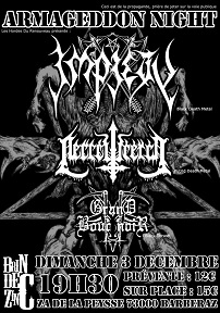 Il est à peu près minuit lorsque les dernières salves de batterie sont tirées dans le Brin de Zinc. Les supplications du public n'y changeront rien, Impiety quitte la scène en laissant derrière lui une assemblée détruite par tant de folie et d'insanités. Je pourrais toujours revenir sur le peu d'affluence mais je préfère retenir la qualité des trois groupes présents sur cette affiche et la montée en puissance de l'ambiance au fur et à mesure de la soirée. Une bonne surprise, un gros coup de coeur et un bulldozer lancé plein fer, tel pourrait être le résumé de cette claque que je ne suis pas prêt d'oublier. En tout cas, immense merci aux Hordes Du Renouveau pour cette affiche décoiffante et à très vite pour de nouveaux pétages de nuques... Hail Satan !!