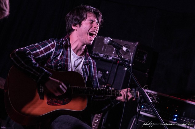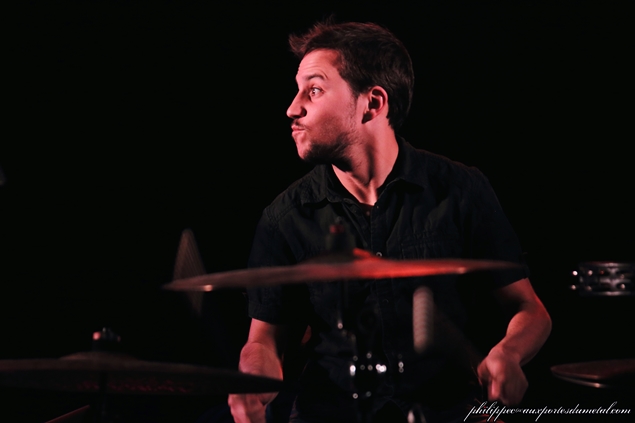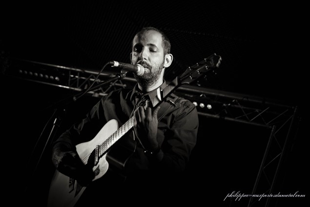 C’est au tour de Klone de monter sur scène. La scène organisée autour du kit de Caryl le percussionniste live constitué d’un tom basse recouvert d’un drap noir, d’un charley surmonté d’un tambourin et de deux cymbales. Au deux extrémités de la scène sont installés Guillaume et Aldrick, sur des tabourets hauts. Chacun d’eux est muni d’une superbe Fender électro acoustique reliée à un petit ampli Fender. Le son est impeccable. Yann est assis à côté d’Aldrick, lui aussi perché sur un tabouret haut.