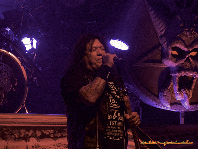 Chuck Billy se balade de part en part de la scène avec un espèce de pied de micro stylisé, illuminé façon sabre laser. Il est très mobile et c’est différent d‘autres prestations (exemple : Hellfest 2013).