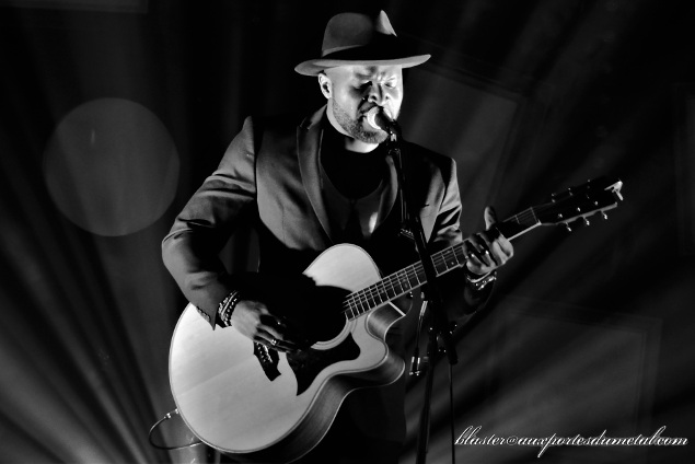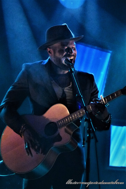 La première partie est assurée par un certain Kevin Davy White. Ce chanteur guitariste aime bien brouiller les pistes... son nom ne sonne pas très français, mais il commence à s'adresser à nous dans notre langue en nous disant que "c'est bon de jouer à la maison", le reste du set ne sera composé que de compos chantées dans la langue de Shakespeare et quand il nous parlera, ce sera plus en anglais qu'en français... et pourtant, il vient de Paris. Quelle énigme... Bon, en fait, il a vécu (et vit peut-être toujours, je ne suis clairement pas assez informé) en Angleterre et a même participé, avec un certain succès, paraît-il, à X Factor (l'émission télécrochet britannique, pas l'album calamiteux d'Iron Maiden). Après l'avoir découvert, je ne suis pas surpris qu'il ait tenté de se faire connaître ainsi car il a une très belle voix, aussi chaleureuse que puissante.