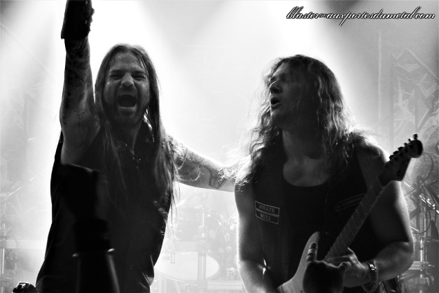 Une petite pause réglementaire et ce fut au tour d'Iced Earth d'investir la scène du Forum. Et c'est parti pour une petite heure et demie de metal, entre heavy et thrash mélodique, servi à coups de gros riffs tranchants. Le début du concert propose un enchaînement de titres bien percutants, idéalement choisis pour mettre le public dans de bonnes dispositions. Voyez plutôt : Great Heathen Army, Burning Times (toujours aussi imparable) et l'excellente Dystopia (seule rescapée de l'album du même nom), si ce n'est pas de l'excellente entrée en matière, je ne sais pas ce que c'est... Le groupe est, comme à son habitude, ultra carré. La rythmique est solide, le son de guitare énorme... le tout est livré avec grande précision et avec un son terrassant. Peut-être même un peu trop. Ce n'était pas le soir pour oublier les bouchons... Profitons-en pour aborder l'un des seuls vrais défauts de la soirée : on entend bien tous les instruments mais la voix de Stu Block n'arrive pas à trouver sa place au milieu de cette avalanche de guitares, basse et batterie apocalyptiques. C'est dommage car le gars est plutôt doué mais là, le micro n'est pas réglé assez fort... On l'entend mieux à certains moments mais ce n'est jamais génial et, parfois, certains morceaux de bravoure passeront à la trappe, faute d'un mix équilibré.