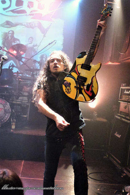 Le set commence par la chanson d'ouverture du dernier opus, Victory et sa ligne de chant qui rappelle fortement le Trooper de la vierge de fer. Le groupe est en place, vindicatif et souriant, la qualité de jeu des différents musiciens s'impose immédiatement à l'auditoire... et Todd Michael Hall est bluffant d'aisance vocale. Je suis très agréablement surpris... Pas parce que je m'attendais à une prestation médiocre de sa part dans l'absolu mais plus, parce qu'un peu plus tôt en fin de journée, après avoir interviewé ses compères, je l'avais croisé contrarié, se plaignant de maux de gorge et envisageant de se rendre rapidement dans une pharmacie avant le concert. Eh ben, si ce qu'on a entendu un peu plus tard, c'est du Todd Michael Hall souffrant de maux de gorge, je n'ose imaginer ce que ça doit donner quand le gars est en pleine forme. Il a été parfait, clair (cristallin), puissant et ne se refusant aucune montée dans les aigus (et dans le répertoire de Riot, il y en a un paquet). Impressionnant.