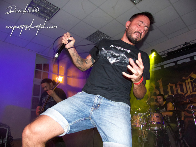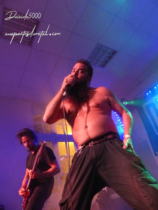 La machine Blood Ages, death metal brutal toulousain, est rodée et plus habituée à la tête d’affiche. Dès 23h20, la bande d’Aniki (chant) va nous bastonner la tête. Aniki bouge de partout, prend des poses improbables et nous siphonne le cérumen à coups de truelle.