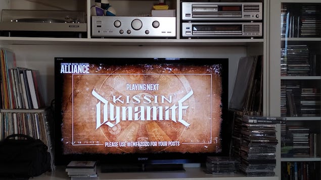 Le samedi, la chaleur aidant, je suis resté avachi devant ma télé quasiment non-stop. J’utilise un ChromeCast pour caster mon PC sur le grand écran du salon, lui-même connecté à ma chaine HiFi, donc son et image sont très bons, au final le moins confortable à la longue, c’est mon canapé. Ça reste grand confort par rapport à l’expérience Festival. Bien sûr, l’ambiance n’est pas au rendez-vous. D’ailleurs, ça choque assez quand les groupes (qui ont fait l’effort d’enregistrer un set complet) s’arrêtent entre deux morceaux : c’est le silence absolu. Les pauvres !! Ils essayent de faire comme si, “Hello online people”, “How are you doing?”, “Thanks for watching”, “What are you guys drinking?” Et même entendu “Time for a circle pit in your living room”. Compliqué tout ça. Tous nous donnent rendez-vous en live en 2021. On l’espère. Pendant ce temps, le site web propose quelques options pour échanger, en tchat, les commentaires pleuvent, pas toujours très intéressants, mais bon. Sinon, le festival propose d’envoyer des photos de vous (et vos potes) en train de mater le festival. Il y a même des pass 2021 à gagner. Sur le tchat, je note que, dans certains cas, les groupes répondent aux commentaires, c’est sympa.
