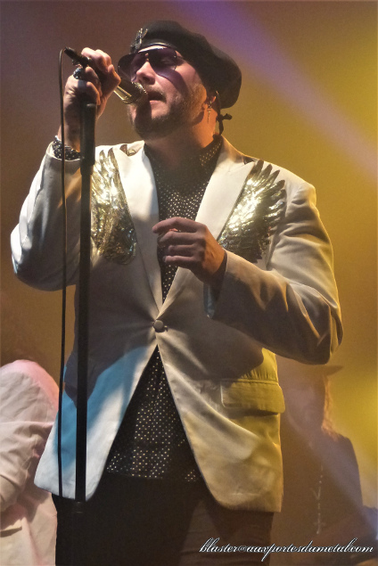 Sur Living For The Nighttime, l'un des rares moments de la soirée consacré à un autre album que les trois derniers, la mise en scène continue. Les choristes, plus en avant que sur les concerts précédents (elles sont carrément sur le devant de la scène maintenant), ont chacune un combiné téléphonique attaché à leur pied de micro... elles s'en serviront pour mimer la conversation qui a lieu à un moment du morceau. Vous avez dit kitsch ? Bah oui, mais c'est The Night Flight Orchestra en même temps... vous deviez vous y attendre un peu, non ? Un peu plus tard, sur la plus posée Golden Swansdown, Björn se fera couvrir d'une cape dorée par le duo d'hôtesses qui, de temps à autre, pendant le show, n'hésiteront pas trinquer à notre santé (enfin, j'imagine, elles trinquaient peut-être à autre chose), une coupe de champagne (apparemment... mais les apparences sont trompeuses, on le sait bien) à la main.