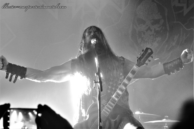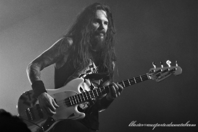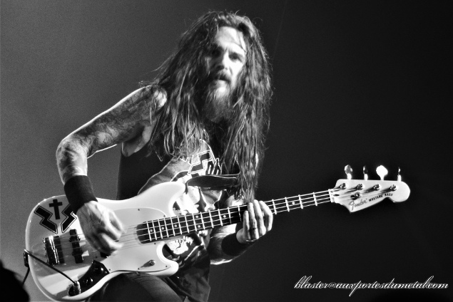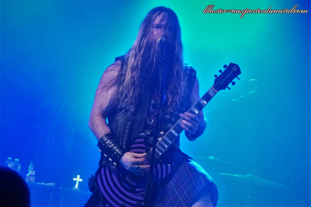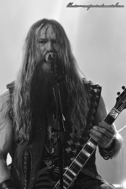 Niveau mise en scène, c'est très simple. Un backdrop représentant la faucheuse avec le nom du groupe à son sommet, un batteur qui ne retient pas ses coups et fait preuve d'une belle énergie, Blasko moins démonstratif mais très efficace à la basse et un Zakk qui attire naturellement tous les regards puisque dès qu'il ne chante pas, il monte sur une sorte de petite estrade située au milieu de la scène pour jouer de la guitare dans sa position la plus connue (jambes écartées avec crinière secouée en rythme de gauche à droite). De toute façon, c'est bien simple, tout est dans le nom du groupe. Si vous êtiez venus en espérant autre chose que Zakk Wylde jouant du Black Sabbath, eh ben... il ne fallait pas. C'est un hommage, ni plus ni moins. Cependant le groupe s'appelle bien Zakk Sabbath, le guitariste est donc très en avant et conserve le style pour lequel il est reconnu depuis quelques années. Hommage donc, mais pas que... car il remanie les solos à sa sauce et se lance d'ailleurs régulièrement dans des développements qui ne font pas partie des titres originaux. C'est à la fois ce qui fait, à mon sens, l'intérêt et la faiblesse de ce show. L'intérêt parce que si les classiques étaient calqués à la note près sur leurs modèles, sans aucune réinterprétation, l'exercice, même bien fait, se révélerait vite limité. Mais la faiblesse, parce que les solos de Zakk sont trop longs à mon goût et pas toujours, musicalement parlant, très captivants. Mais le public est content car le grand blond fait le show et, comme il l'avait fait il y a quatre ans au Cabaret Sauvage, il se balade dans la salle pour exécuter ses longs solos (dans la fosse d'abord en milieu de concert, puis au balcon pour le War Pigs final qui a bien dû faire le double de sa durée initiale). Et tout comme il y a quatre ans également, pas de communication avec le public, quasiment aucun mot, sauf à trois ou quatre morceaux de la fin quand Zakk présente son groupe.