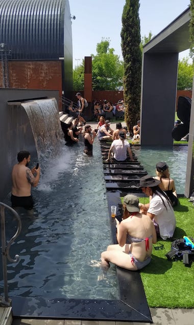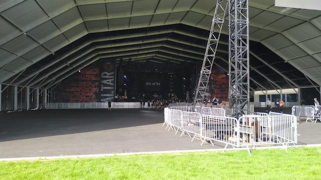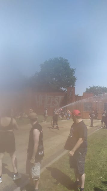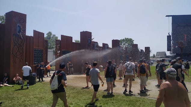 Il ne reste plus que la tente Valley pour trouver de la l’herbe et piquer un roupillon sous une tente. Je comprends l’idée de se débarrasser de la poussière qui a été un problème pendant plusieurs années, mais le goudron, c’est chaud et du chaud, nous avons eu notre dose pendant ces 2 premiers jours: 38, 41, les températures s’affolent et c’est la guerre de l’ombre qui commence. Le moindre centimètre carré d’ombre est exploité. Le festival propose toujours les 2 murs d’eau, je crois que ça en aura sauvé plus d’un. Nouveau cette année un énorme canon brumisateur, mais surtout, l’intervention des lances à eau, comme certaines années précédentes: depuis le devant de la scène, manipulées par les agents de sécurité, ou sur le coté de MainStage 2, manipulées par les pompiers. Quel pied de pouvoir écouter des concerts et se faire arroser à intervalles réguliers !! J’avoue que moi, cramer au soleil, ça ne me branche pas, donc j’avais adopté une chemise blanche à manches longues, et un pantalon de trekking à manche amovibles. J’ai eu chaud, comme tout le monde, mais je n’ai pas eu de coup de soleil, je ne suis pas sûr que tout le monde puisse en dire de même. Le festival avait annoncé l’autorisation de rentrer avec des gourdes et des bouteilles d’eau, ça a quand même bien aidé. Au final j’ai entendu qu’il y a quand même eu environ 800 interventions, mais moins de 20 nécessitants une hospitalisation au CHU de Nantes. Perso, j’ai abandonné la bière et me suis mis au Perrier. J'ai cru comprendre que je n'ai pas été le seul puisque la consommation de bière a baissé de 20% par rapport aux années précédentes.