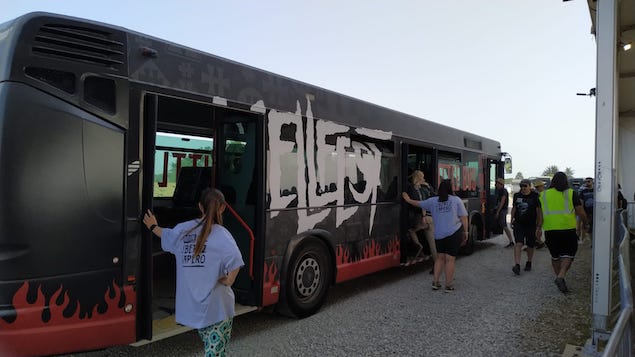 Pas facile de faire un bilan de ce premier week-end du Hellfest 2022, puisque nous ne vivons pas tous le festival de la même manière. Voici ma version de l’évènement. Après 2 ans d’absence pour cause de pandémie, nous retrouvons enfin le Hellfest. Et pour rattraper le retard accumulé par ces deux éditions annulées le Hellfest s’est transformé en un mega-Hellfest de 2 week-ends, un premier “normal”, de trois jours et un second de 4 jours le week-end suivant devenant ainsi le plus gros festival de France (420000 festivaliers). Pour certains c’est l’occasion de se faire la totale et de rester sur place les trois jours vides. Pour moi, ça ne sera que le premier week-end, j’ai une obligation boulot pour le second. C’est clair que les têtes d’affiche du second week-end font tourner la tête, mais il faut savoir se contenter de ce qu’on a. Il y a déjà de quoi faire avec ce premier week-end. Nous allons faire deux éditions spéciales pour vous raconter tout ça. Première remarque sur les navettes et le fameux parking ouest: l’idée de désenclaver le centre de Clisson est excellente mais les moyens n’ont pas été mis en œuvre. 8 bus pour assurer les aller-retour ça n’est clairement pas assez. Pour nous, le vendredi, arrivés pour l’ouverture, ça ne c’est pas trop mal passé, seulement un petit quart d’heure d’attente, mais le soir, c’était la galère, la queue est interminable et nous décidons d’ajouter une demie-heure de marche à la fatigue de la journée.