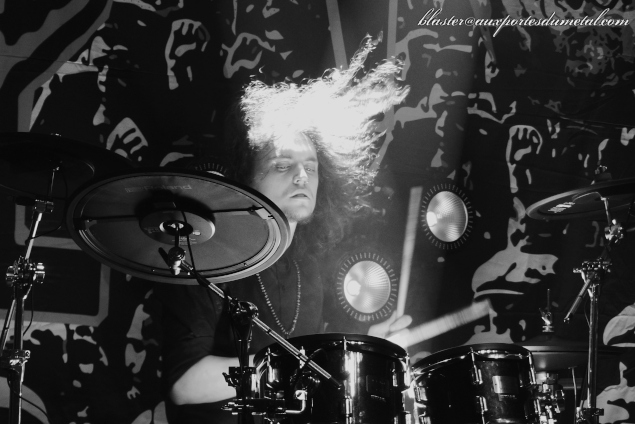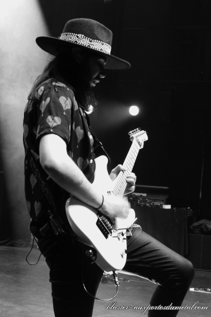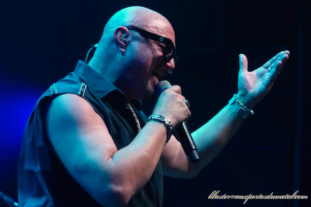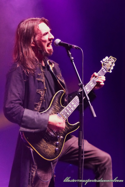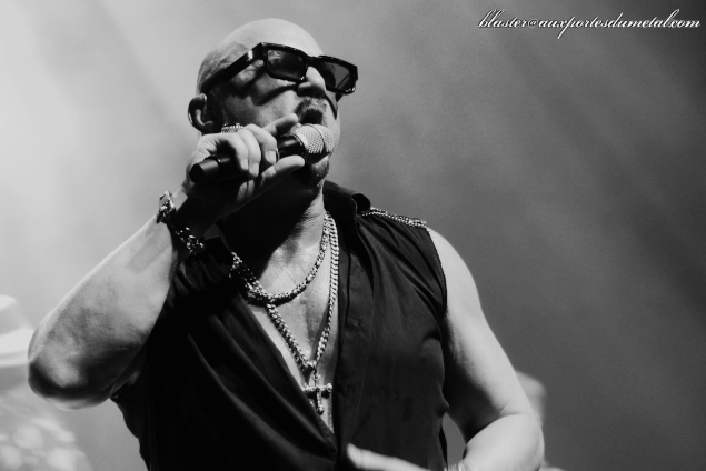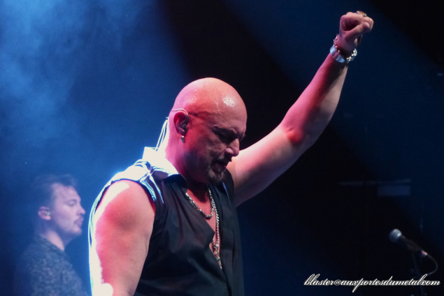 La bonne surprise provient de Tate lui-même, qui du haut de ses soixante-quatre ans, a conservé son timbre de voix reconnaissable entre mille et chante pas mal du tout. Evidemment, on ne va pas mentir, il n'est pas absolument irréprochable... on le sent parfois un peu en difficulté, certaines notes sont contournées ou peu tenues, c'est normal. Si vous pensiez qu'il pouvait encore chanter comme il y a trente-cinq ans, vous pensiez mal et aviez des attentes totalement déraisonnables. Non, franchement, malgré quelques déraillements ou petites fragilités ici et là, il s'en sort vraiment très correctement (il faut prendre en compte la difficulté des lignes à exécuter et l'âge du monsieur aussi) et même mieux qu'à une époque. Il a certainement dû travailler (ou modifier son hygiène de vie, je ne sais pas) pour revenir à ce niveau. Je me souviens l'avoir vu en 2009 (au Hellfest) puis avoir regardé des vidéos dans le début des années 2010 qui laissaient entrevoir un futur pas très lumineux pour le vocaliste... A part cela, il vit toujours ses chansons avec intensité... la prestation n'est pas que vocale mais bien théâtrale et généreuse. Le frontman arpente la scène dans tous les sens, en long en large, en profondeur, va voir tous ses musiciens et s'avance très régulièrement pour être au plus près des premiers rangs.