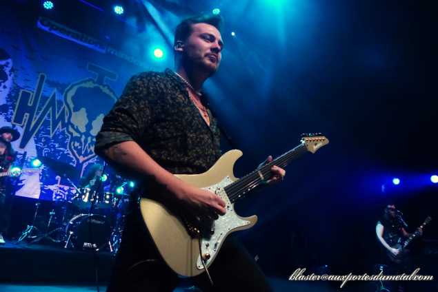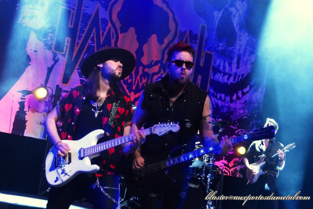 Sympathique mais pas totalement convaincant en ce qui me concerne. Pourtant, les musiciens ne ménagent pas leurs efforts ! Ils en font beaucoup... voire peut-être un peu trop (le guitariste soliste fait dans le lever le guitare, les coups de pieds, les sauts sur place... une sorte de croisement entre Janick Gers et Yngwie Malmsteen... comme si le gars n'avait pas réussi à choisir entre ses trois passions : la guitare, la dance et les arts martiaux... le bassiste est hilare, s'amuse avec son pote guitariste et donne souvent dans des mouvements de hanche à ne pas soumettre aux yeux de jeunes enfants). Leur enthousiasme fait face à un accueil sympa, souriant, pas délirant non plus. L'ambiance sera plus chaleureuse sur la reprise vitaminée de Breaking The Law de vous savez forcément qui.