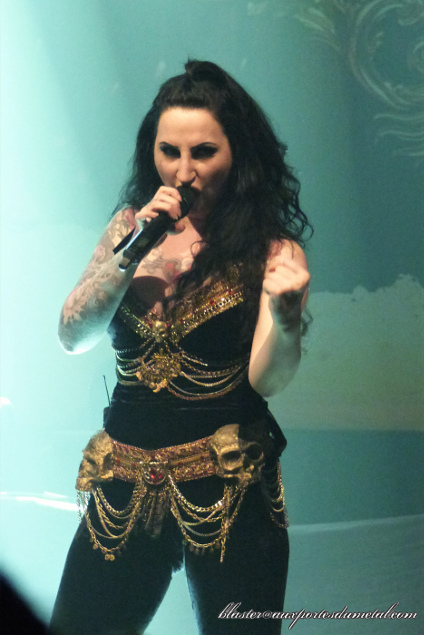 Setlist League Of Distortion : 01. My Revenge 02. Solitary Confinement 03. It Hurts So Good 04. Rebel By Choice 05. Wolf Or Lamb 06. L.O.D. Eleine Cela fait un petit moment que je vois passer le nom d'Eleine, sans jamais vraiment avoir pris le temps de m'arrêter et voir (ou plutôt entendre) de quoi il en retournait. Ce soir, c'est donc l'occasion d'en savoir plus. Je suis vite fixé : les Suédois livrent un metal symphonique bien heavy et enlevé. Vu le style, on ne sera pas étonné d'avoir du sample à profusion (pas de claviériste sur scène et, j'imagine, pas les moyens d'emmener un petit orchestre en tournée... sans blague). La section rythmique est bien robuste et la vocaliste a plutôt une jolie voix. Les premiers titres, tous issus du dernier album en date (Dancing In Hell) sont sympathiques mais assez convenus dans leur genre. J'aime bien, c'est solide, mais ne suis pas plus ému que cela. Ava Of Death, en troisième position, va légèrement changer la donne avec un bon refrain qui la fait sortir du lot. Puis All Shall Burn, dans un style heavy bien épique, fera encore mieux.