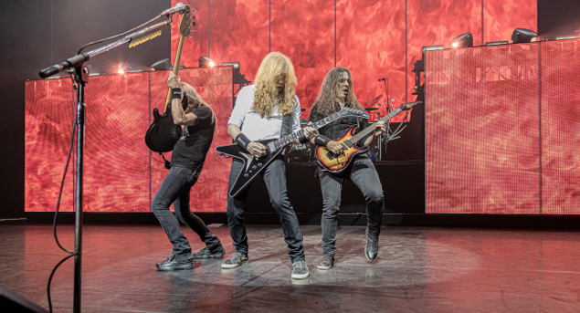 Existance nous présente un nouveau morceau, Brighter Days, qui figurera sur l'album prévu courant 2024... et comme ses petits copains, il passe impeccablement sur scène. La conclusion se fera sur deux morceaux plus anciens : Breaking The Rock et From Hell. Six titres en une demi-heure, on n'a pas vu le temps passer... on en redemanderait sans problème, Existance s'est mis l'Olympia dans la poche avec une facilité déconcertante. Ces gars-là se sont montrés, comme toujours aurais-je envie d'ajouter, très convaincants et leur amour du heavy traditionnel a parlé à la majorité de l'assistance. A suivre ! Setlist Existance : 01. Wolf Attack 02. Legends Never Die 03. Dead Or Alive 04. Brighter Days 05. Breaking The Rock 06. From Hell A 21 heures, Megadeth foule les planches de cette scène mythique... Enfin non, le groupe se pointe avec huit minutes de retard (ce petit détail aura son importance plus tard quand je râlerai, vous verrez)... et tout d'un coup, la température monte de plusieurs degrés (ce qui, franchement, vu la chaleur ambiante et la densité de la fosse, n'était pas plus nécessaire que cela). La scène est bardée d'écrans diffusant un montage animé pendant que l'intro de Prince Of Darkness sort des enceintes (comme ce fut le cas au Hellfest en 2022)... et le groupe déboule sur Hangar 18. Et là, c'est l'explosion. Sur scène, bien sûr, les acolytes de Mustaine affichent une forme impressionnante qui ne se démentira pas jusqu'à la fin du set. James LoMenzo et Kiko Loureiro l'arpentent de long en large, le sourire aux lèvres... Dirk Verbeuren martèle ses fûts avec enthousiasme (et puissance, cela va sans dire). Mustaine est un peu plus statique et - à ce stade du concert - un peu moins audible (vocalement parlant) dans le mix mais le son va vite s'améliorer... Mais quand je parle d'explosion, c'est davantage au public que je fais référence. Les fans sont chauds, ils sont bouillants... à tel point qu'ils pourraient faire fondre l'édifice qui nous accueille. J'ai eu la chance de voir quelques concerts de Megadeth depuis le milieu des années 90 et - bien qu'il soit fort possible que ma mémoire me joue des tours - je ne me souviens pas d'avoir vu une assistance aussi festive que ce soir. La fosse saute, clame, crie, chante (pas juste les paroles, les riffs ou les leads de guitare également, on se croirait à un show de Maiden !), pogote avec ardeur... bref, elle donne tout, elle n'est pas venue pour s'économiser. Et, vu le set best-of concocté par le groupe, ça n'est pas près de se calmer !