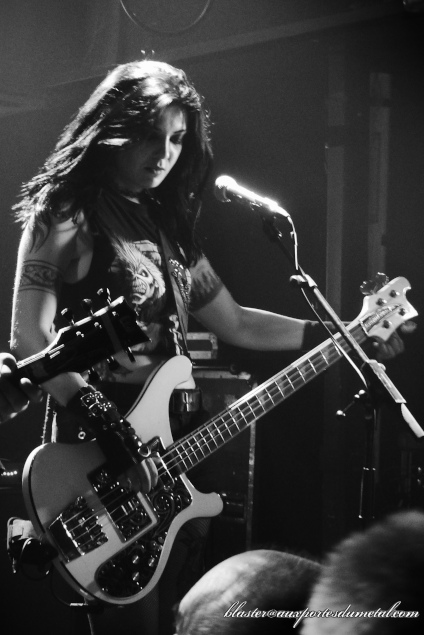 Julian introduira le titre Rock Lives In My Soul en précisant que bien que la plupart des paroles de ses chansons pourraient s'adresser à des garçons de dix ans, certaines contiennent des messages plus importants. C'est justement le cas de celle-ci qui prend position contre le sexisme. Peu importe les paroles des titres joués ce soir, ce qui retient l'attention c'est qu'aucune des salves proposées n'ennuie l'assistance. Le groupe est très en place, on se régale avec des rythmiques bien envoyées, on entend et apprécie la basse de Becky bien mise en avant (son jeu est assez remarquable en plus) et les solos dispensés par Tom ou Julian (parfois les deux en même temps) ne manquent ni d'accroche ni de dextérité (ça tricote bien vite sur Road Warrior !). On sent bien l'influence de la vieille école, notamment celle d'Iron Maiden parfois... mais cela n'est jamais abusé ou gênant. Les références sont bien incorporées au sein de compos changeantes qui comprennent parfois des passages surprenants (les chœurs féminins presque opératiques à la fin de Embrace The Demons ou le passage a cappella dans Road Warrior). Eh bien, les amis... quel show ! Quarante-cinq minutes ont filé bien vite et je ne me suis pas ennuyé une seconde. Fury, c'est pêchu, speed, rock'n'roll, sexy... en un mot : fun ! D'ailleurs, je suis tellement emballé par le concert que je quitterai le Petit Bain en fin de soirée avec le CD acheté au stand merch du groupe.