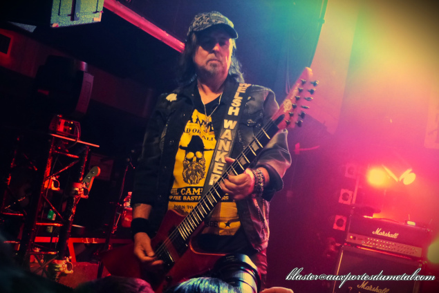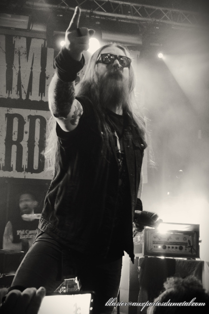 Trois chansons jouées et déjà deux reprises de Motörhead ? Oui. Il est donc là le changement de setlist : c'est bien l'ancien groupe de Phil Campbell qui va être mis à l'honneur ce soir. C'est bien simple, sur seize titres joués, onze seront des reprises de la bande à Lemmy, une chanson sera extraite du répertoire de Hawkwind (Silver Machine) et seulement quatre proviendront des albums de Phil Campbell And The Bastard Sons ! Et ça passe ? Totalement. Personne ne donne l'impression d'avoir envie de se plaindre. Surtout pas le groupe de joyeux drilles légèrement éméchés et qui enchainent les pogos sans faiblir ! Pour ma part, cela est fort sympathique mais je ressens tout de même une petite déception. J'étais venu voir les Bastard Sons et, ayant apprécié pas mal de leurs titres récents sur album (comme Schizophrenia, Hammer And Dance, Strike The Match et quelques autres), j'avais hâte de les entendre en live... Et en fait, il n'y aura qu'un seul extrait du nouvel album censé être promu ce soir, le très bon Maniac avec son refrain plein de "Fuck you!". C'est un peu léger mais bon, Phil nous avait prévenu dès le début... Vraisemblablement, il doit être plus simple pour Joel de chanter du Motörhead que des morceaux "perso" récents.