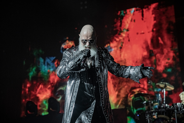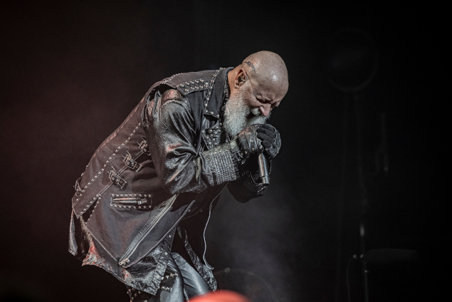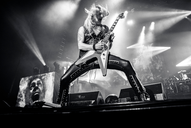 La star du show, reconnaissons-le, c'est surtout Richie Faulkner avec ses poses de guitar hero. Ce dernier qui a pris une belle place et a joliment développé son jeu (ainsi que son sens de la composition) ses dernières années et il fait le show avec panache ! Mais non, je n'oublie évidemment pas le Metal God himself, le charismatique Rob Halford, arpentant la scène avec assurance et sortant de son gosier quelques notes encore bien impressionnantes. A l'instar de Byford, Halford n'est plus tout jeune (soixante-douze ans) et il lui arrive d'ailleurs d'atteindre (et ne pas dépasser) certaines limites vocales dues à son âge mais le monsieur s'en sort tout de même convenablement. Painkiller est toujours un moment un peu difficile, il y a des effets sur la voix (de la réverb' pour faire tenir plus longtemps quelques notes notamment), certaines lignes sont chantées un octave ou deux plus bas... mais le Rob reste classe et arrive même à m'impressionner sur quelques titres (je pense notamment au surprenant Saints In Hell, extrait de Stained Class). Bane me l'a dit : "Ne doute pas du patron !" (vous pourrez d'ailleurs retrouver l'avis synthétique de Bane sur cette soirée en bas de page). Andy Sneap est plus discret que Faulkner mais fait le taf, Ian Hill reste cantonné à son petit coin de scène à droite, comme à son habitude et Scott Travis cogne toujours avec la puissance et la rigueur métronomique qu'on lui connait.
