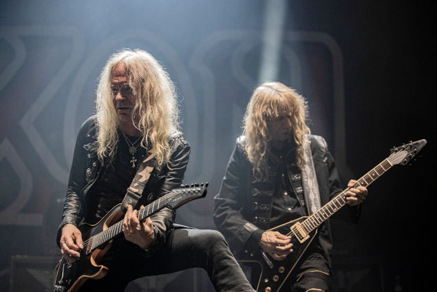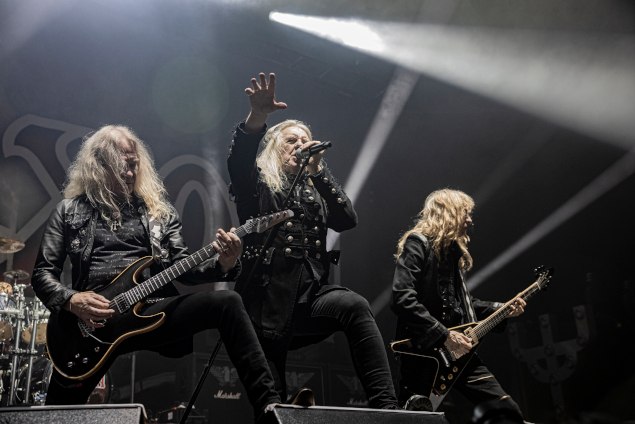 2024 est loin d'être terminée mais on peut déjà affirmer qu'il s'agit d'une année singulière au début de laquelle les grands ancêtres du Metal tiennent à démontrer toute leur pertinence. En janvier, Saxon sortait Hell, Fire And Damnation, un album bien percutant et leur meilleur depuis belle lurette. Deux mois plus tard, c'était au tour de Judas Priest de nous étonner avec Invincible Shield, un disque tout simplement impressionnant, encore plus réussi que le déjà très honorable Firepower, et clairement leur opus le plus enthousiasmant depuis le mythique Painkiller sorti trente-quatre avant lui. Deux groupes, deux légendes, deux exploits. Les fans de Heavy anglais étaient à la fête le 8 avril dernier car ces deux formations ont joint leurs forces pour une tournée intitulée "Metal Masters"... un titre pas forcément humble mais, pour le coup, pas forcément faux. D'autant plus que, comme on était sur le point de le découvrir dans un Zénith quasi-complet, les papis britanniques, après nous avoir surpris en studio, s'apprêtaient à en faire de même sur scène. C'est Saxon qui ouvre le bal. Le groupe monte sur scène quelques minutes avant 19h30 et la première leçon de la soirée commence. Le son est carré, clair et puissant, le light show plus que correct... et, surtout, le groupe, Biff Byford en tête (soixante-treize ans quand même !), affiche une belle forme. C'est la chanson titre du tout nouvel album qui lance les hostilités et, immédiatement, la formation britannique se montre conquérante et percutante. Evidemment, ces messieurs ne sautent pas partout... et c'est bien normal, le plus jeune est le bassiste Nibbs Carter (cinquante-sept ans), les autres ont une bonne soixantaine, voire un peu plus pour Nigel Glockler, le batteur (toujours bien en place) ou notre fameux Biff déjà cité dont la voix ne semble pas trop vieillir... mais l'énergie dégagée par le quintet me fait immédiatement ressentir admiration et respect. Attention cependant, l'énergie c'est bien mais ça ne fait pas tout, c'est mieux quand les compos choisies sont solides. Là aussi, pas de quoi se plaindre : dans un premier temps Saxon alterne morceaux récents (Hell, Fire and Damnation, There's Something In Roswell, Madame Guillotine tous extraits de leur dernière livraison... ainsi que le titre Sacrifice) avec quelques classiques indémodables tels que Motorcycle Man et And The Bands Played On pour le plus grand plaisir des fans, visiblement très réceptifs.