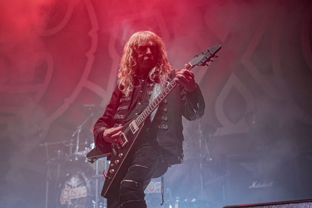 Pas de grands discours, quelques remerciements tout de même et une poignée de mots en français aussi pour se mettre encore un peu plus le public dans la poche... L'accent est mis sur la musique. Saxon a une heure pour convaincre et propose pas moins de treize compos pour ce faire. Si la première moitié du set effectuait des va-et-vient entre le présent et passé, la seconde reste totalement bloquée dans les 80s, s'assurant donc un engouement des plus enthousiastes. Eh oui, après Madame Guillotine (un nouveau classique, n'ayons pas peur des mots), Byford et compagnie enchainent les standards que tout le monde connait (ou devrait connaître) : Heavy Metal Thunder, Strong Arm Of The Law, Crusader... Un véritable best-of ! Pendant ce temps-là, les deux guitaristes Doug Scarratt et le nouveau venu Brian Tatler (Diamond Head, on n'a pas choisi n'importe qui pour remplacer Paul Quinn, dites donc !) gratouilles avec sobriété et nous régalent... pendant que Carter se montre toujours plus agité que ses copains ("jeunesse", toute relative, oblige) et parcourt la scène en brandissant sa basse aux quatre vents, sans oublier de chanter avec enthousiasme (même quand il n'a pas de micro devant lui) une quantité non négligeable de paroles. Tout cela est servi par un son exemplaire qu'on aimerait bien conserver toute la soirée.