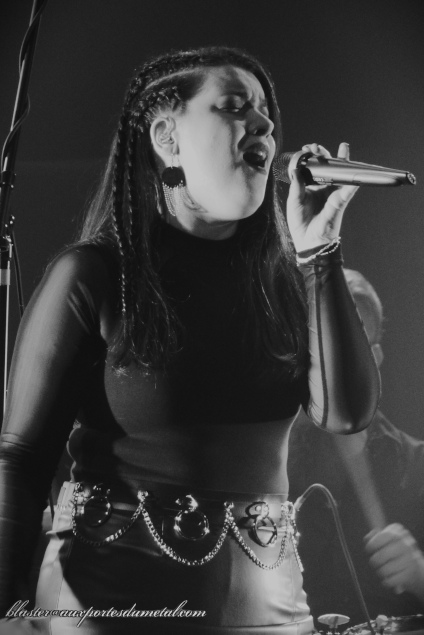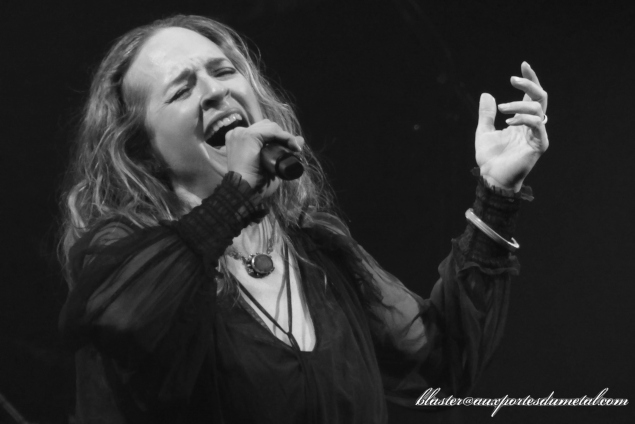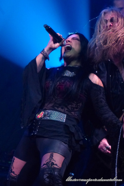 Avec le troisième morceau, la chanteuse sourit davantage, elle commence à prendre ses aises. La rythmique de ce Travellers est plus lourde, le metal reprend ses droits (il n'était pas totalement absent des titres précédents mais cela restait tout de même assez inoffensif). Ce metal symphonique n'est décidément pas désagréable mais ne me bouleverse vraiment pas. Sympathique sans plus, je dirais. Mais, après un Stars dans la lignée de ce qui a précédé, on nous annonce quelque chose d'un peu différent avec le cinquième titre Shadow Engine. L'ambiance est en effet plus "dark" et mystérieuse, la rythmique est plus puissante... ça devient très sympa. Suit la présentation des musiciens du groupe sous des applaudissements chaleureux. Il semblerait que le set soit en train de décoller...