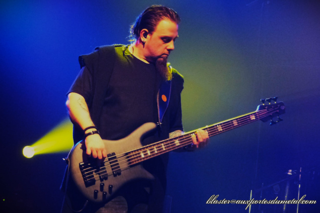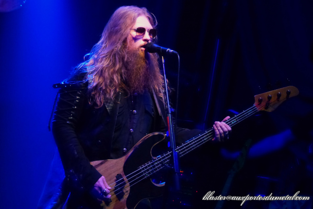 Setlist de Satra : From The Night Sand Of Time Travellers Stars Secret Place Shadow Engine Scarecrow Golden City Puis c'est au tour de Therion de venir nous enchanter. Première chose qui fait plaisir d'entrée de jeu : Christofer Johnsson et ses sbires attaquent avec The Blood Of Kingu (extrait du très bon Sirius B), titre bien heavy et percutant, idéal pour lancer les hostilités... mais surtout ils commencent à 20h30 avec quasiment un quart d'heure d'avance sur l'horaire annoncé. Cela signifierait-il que nous sommes partis pour un concert de deux bonnes heures ? Spoiler : oui, c'est exactement ça. Le lineup a un peu changé depuis la dernière fois que j'ai vu le groupe. Je retrouve avec plaisir Johnsson à la guitare, bien sûr, je reconnais son coéquipier argentin Christian Vidal, présent à la six-cordes depuis l'ère Sitra Ahra (2010), le fidèle Thomas Vikström au chant, l'incroyable cantatrice américaine Lori Lewis qui tourne à nouveau avec le groupe, chose qu'elle n'avait plus fait depuis 2014 il me semble... Mais les autres, je ne les connais pas bien. Enfin si, il y a bien Sami Karppinen, que j'ai dû voir avec Therion vers la fin des années 90 ou le début des années 2000 (ça remonte)... mais je découvre le bassiste Chris David (qui me fait penser à l'acteur Val Kilmer qui serait grimé en métalleux, j'en veux pour preuve la photo ci-dessous) et la vocaliste espagnole Rosalia Sairem qui, d'après un pote chroniqueur, serait le sosie parfait d'Anastacia (la chanteuse pop américaine qui a percé il y a vingt ans) mais en brune... Moui, possible. Le trio de vocalistes nous régale dès le départ, la première chanson jouée a complètement atteint son but, c'est un début de concert impeccable... que Vikström concluera par un joli "Pariiiiiis.... Pariiiiiiiiis... VIVE LA FRANCE !".
