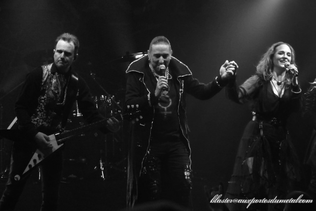 L'ambiance est très chaleureuse, tout le monde a l'air bien en forme et ravi d'être là. Lori Lewis plaisante en nous annonçant que, vu qu'on se trouve au Moulin Rouge, elle s'apprête à danser le French cancan... Avant de nous annoncer un titre extrait des Fleurs du Mal : Mon Amour, Mon Ami (qui sera immédiatement suivi de La Maritza). Ils sont bien reçus (personnellement, je m'éclate moins mais je peux toujours admirer le travail impressionnant des chanteuses). Je me réveille davantage avec les morceaux suivants : Leviathan et l'excellent Asgard qui rappelle à notre bon souvenir l'album Secret Of The Runes. D'ailleurs, c'est le moment de faire une remarque sur la setlist. Elle est généreuse bien sûr, mais surtout, elle pioche dans beaucoup de disques différents. En tout, nous aurons le droit à vingt-deux morceaux extraits d'un total de onze albums. C'est top (même si, évidemment, on trouvera toujours qu'il y a des manques, les fans des premières heures, pré-Theli, n'auront rien à se mettre sous la dent) et balaye une bonne partie de la carrière de Therion en offrant un set bien riche et varié.