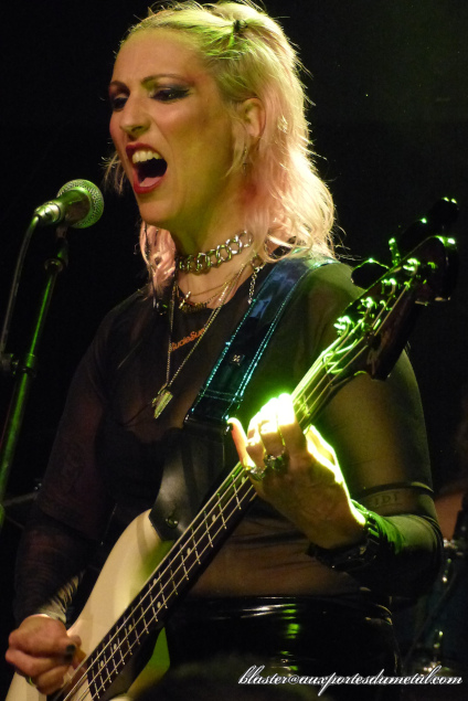 Les musiciens et musiciennes sont montés sur scène et leur set a commencé pleine balle avec Poisoned, un titre bien bourrin qui met tout le monde dans le bain très vite. Les deux messieurs, les guitaristes, très sérieux et concentrés se placent d'entrée de jeu sur le côté et resteront assez statiques. Pas franchement de spectacle de leur part. La batteuse avait l'air un peu plus fun, mais difficile de la distinguer sur cette petite scène. Il y avait déjà plus à voir du côté de Lucie, la bassiste. Cette dernière, qui assurait aussi pas mal de chœurs, était bien plus énergique et expressive, toujours prompte à faire quelques grimaces bien marrantes. À noter que c'est elle qui a dépanné les p'tits gars de Steel Panther lors du Hellfest 2022, ça vous donne une bonne idée du personnage. À noter aussi qu'elle a ensuite passé l'intégralité du set de Wings Of Steel dans la fosse, à brailler et à déconner avec le public.