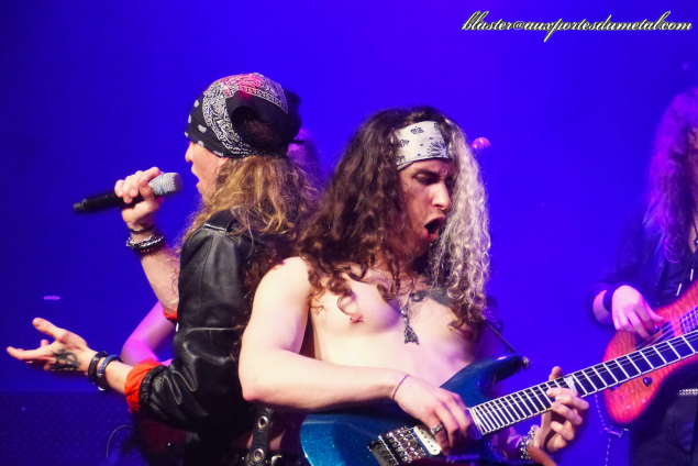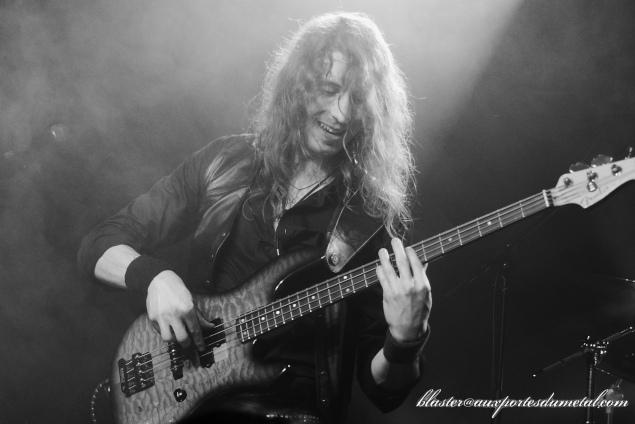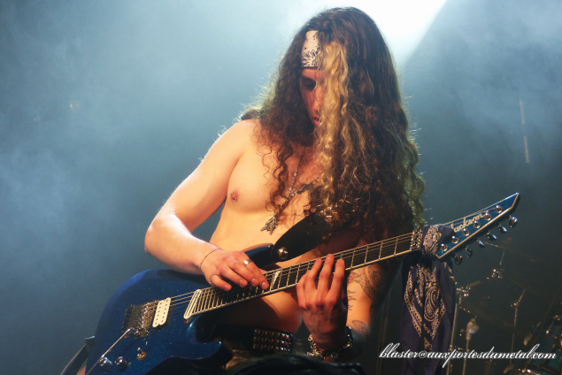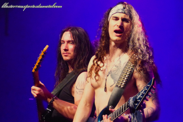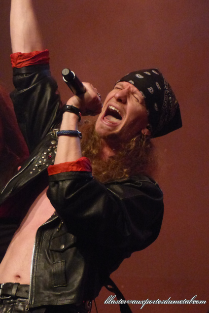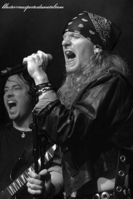 Je vous l'ai dit en préambule : j'avais écouté quelques titres avant le concert, sans être non plus totalement convaincu. Honnêtement, je pensais que le groupe se "contentait" de jouer un heavy/speed à voix suraiguë, un peu à la Riot période Thundersteel, donc avec Moore derrière le micro. Si le timbre de Leo s'apparente pas mal à celui de Tony, il est en fait un poil plus nuancé que ça : s'il peut largement péter des verres quand il chante du heavy/speed - écoutez le titre éponyme pour comprendre de quoi je parle -, il est tout à fait capable de moduler un brin et d'adopter une voix bien plus suave et calme, comme sur la bluesy Garden of Eden. Vraiment un chanteur complet, à l'aise dans pas mal de registres, parfaitement capable de chanter aussi bien sur scène que sur disque... avec un énorme potentiel. D'autant plus que la sympathie du bonhomme, toujours prompt à se marrer et à serrer les pognes des premiers rangs du public, me le rend encore plus attachant. C'est clairement lui qui porte le groupe sur scène car le duo de guitaristes, franchement excellent et qui fait une bonne partie du charme des compos du groupe, est un peu moins expansif.