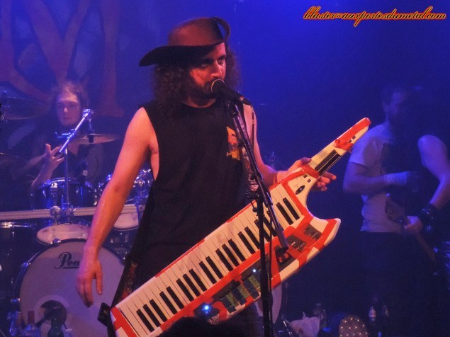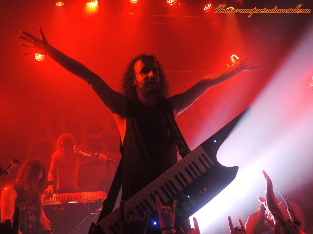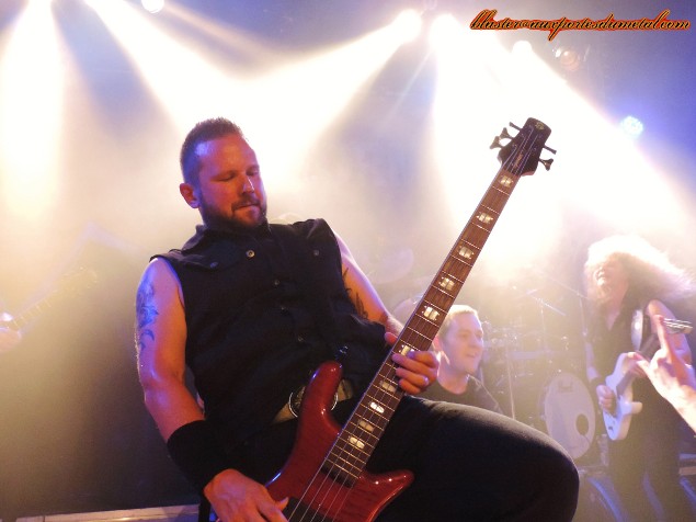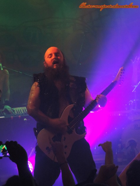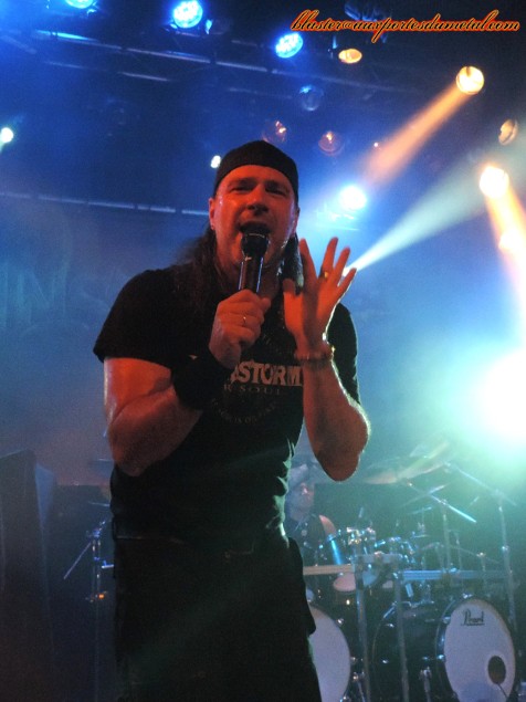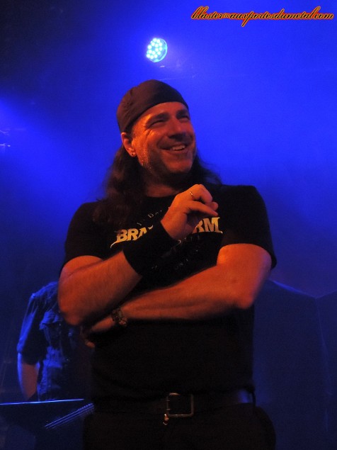 C'est le grand retour de Brainstorm à Paris ce soir, chose que certains d'entre nous attendions depuis des années. Pour rappel, le groupe s'était fait remarquer dans la première moitié des années 2000 avec de bons albums (Metus Mortis, Soul Temptation, Liquid Monster) et avait eu l'opportunité de tourner assez largement à travers l'Europe et notre beau pays, en première partie d'Edguy, par exemple, ou en tête d'affiche... Mais ensuite, les Allemands retombèrent dans une certaine confidentialité regrettable. Quelques albums un peu moins remarquables et tournées qui ont soigneusement évité l'hexagone plus tard, Brainstorm revient enfin avec un disque solide, Firesoul, et cette tournée en compagnie d'Alestorm. Et comme vous pouvez le constater sur la photo ci-dessous, Andy B. Franck, chanteur de son état, est plutôt content ! J'avais de très bons souvenirs des prestations live du groupe... mais ces fameux souvenirs remontaient tout de même à plus de neuf ans. Allais-je retrouver l'efficacité et le charisme démontrés jadis ? Oh que oui ! Déjà, sur scène, les membres sont ultra sympathiques. Aussi souriants qu'en place, les cinq Allemands se font plaisir et ça se voit. L'art de la scène, cela fait un bout de temps qu'ils le maîtrisent, leur aisance de chaque instant fait mouche et le Divan du Monde s'embrase. J'en suis même tout surpris. OK, je savais que le groupe était performant et j'espérais que l'ambiance serait bonne... mais à ce point, non, je ne m'y attendais pas. Niveau setlist, rien ne semble laissé au hasard. Le groupe fait son entrée sur un classique de la grande époque, Highs Without Lows, chanson qui ouvrait le très apprécié Soul Temptation en 2003. Suit Shiver, un titre enlevé et super efficace extrait d'un album moins populaire (Memorial Roots). Super riff, le groupe assure, les fans sont à la fête... Andy B. Franck, toujours aussi charismatique a le sourire jusqu'aux oreilles et annonce qu'ils vont maintenant jouer la chanson titre de leur nouvel album : Firesoul. Encore une fois, bon choix. Le son est bon et clair (même si les guitares auraient pu être un chouilla plus puissantes à mon goût) et on peut apprécier tout le savoir-faire des musiciens. Les riffs et mélodies distillés passent plus que bien, c'est hyper carré. Brainstorm fait partie de ces groupes qui (soyons honnêtes), s'ils ne sortent pas forcément des albums renversants, ont le chic pour proposer une musique véritablement taillée pour la scène. Et puis, il y a la voix puissante et chaleureuse d'Andy. Même si ce dernier n'est pas au meilleur de sa forme ce soir (il me confia avant le concert que, comme il était un peu malade, il ne se frotterait pas à des titres où il était nécessaire de chanter haut comme Erased By The Dark et son refrain Priestien, par exemple), il nous livre une belle prestation. Je pense que beaucoup de vocalistes (en bonne santé) aimeraient être capables de chanter aussi bien que lui ce soir. Que dire d'autre sur la prestation de Brainstorm ? Le groupe puise dans son répertoire et sort quelques classiques qu'il ne fallait pas oublier comme la puissante Fire Walk With Me ou Worlds Are Coming Through. Le groupe fera un bref et unique détour par l'album Metus Mortis avec Hollow Hideaway (dommage qu'il n'y ait pas eu Blind Suffering) et repassera par la case Soul Temptation avec l'écrasante Shiva's Tears et la speed Doorway To Survive. Finalement et paradoxalement, c'est le nouvel album (dont le groupe est pourtant très fier) qui n'est pas tant représenté que cela avec seulement deux extraits : Firesoul et And I Wonder. Les fans auront l'occasion de donner de la voix sur le single All Those Words (deuxième et dernier extrait de Liquid Monster). Ce que je retiens de tout cela, c'est l'aspect pro et fun de l'ensemble, la rapidité avec laquelle le show passe (le groupe a joué un peu plus d'une heure) et l'excellente ambiance sur scène comme dans la salle. Andy B. Franck aide les fans à monter sur scène et se marre avec eux, il présente ses collègues avec humour (il nous demande notamment et plus ou moins discrètement d'acclamer le batteur par son nom "Dieter ! Dieter ! Dieter !" avant qu'il n'ait fini de le présenter) et le guitariste Thorsten Ilhenfeld s'amuse à s'adresser au public dans la langue de Molière et ressortir ses vieux cours de français avec des phrases aussi essentielles que "J'ai acheté une voiture". Brainstorm a totalement réussi son retour chez nous. Le public ne s'y est d'ailleurs pas trompé et a reservé un accueil royal aux Allemands (qui ont eu l'air sincèrement touchés). Pendant tout le concert, les fans n'auront cessé de chanter, bouger, crier ou monter sur scène pour se jeter dans la fosse... Pendant ce temps, la température est devenue à la limite du supportable et à l'heure où Brainstorm quitte la scène, on peut dire que le Divan du Monde est véritablement en nage. D'ailleurs, mon collègue et moi profitons de la pause avant Alestorm pour aller nous rafraîchir dehors (comme pas mal d'autres personnes du public d'ailleurs) et boire un coup. On loupe même la première chanson du dernier groupe de la soirée. Zut... mais aucun regret, c'était ça ou la mort (ok, j'en fais un peu trop mais quand même, il faisait vraiment une chaleur à crever...). Setlist de Brainstorm : 01. Highs Without Lows