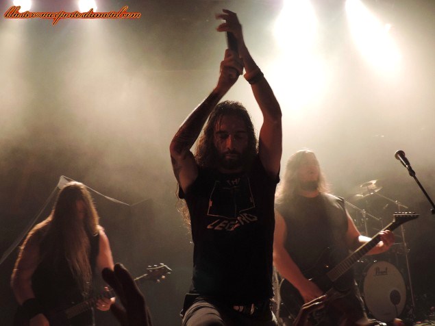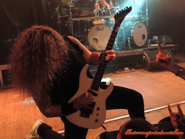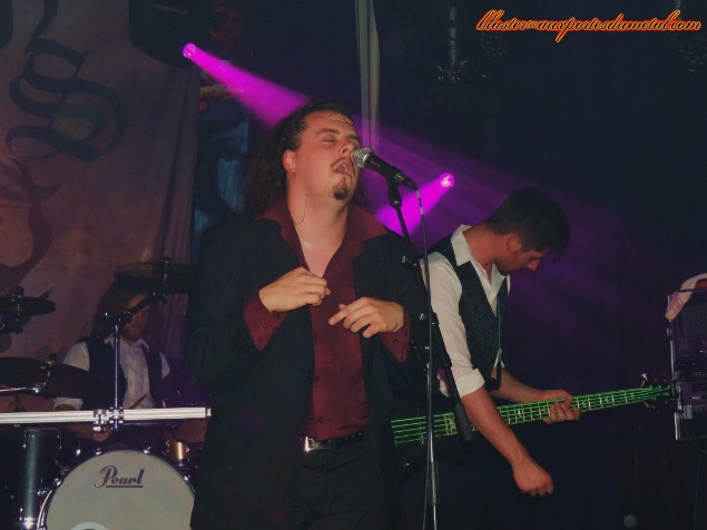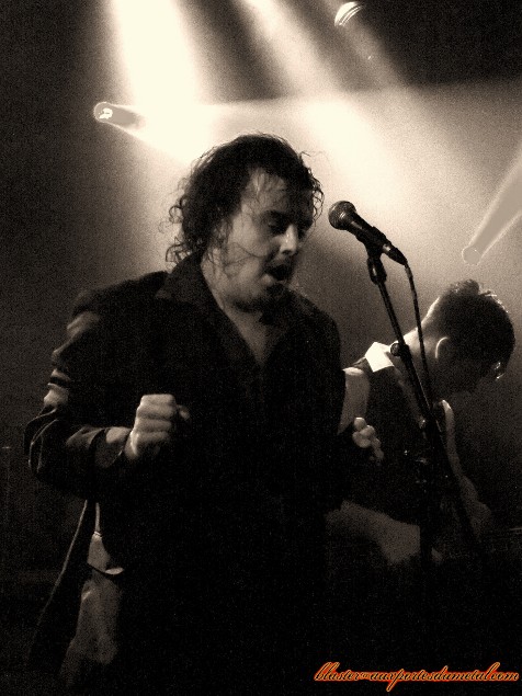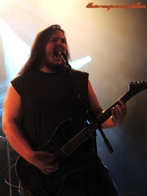 Ce fut ensuite au tour des Canadiens de Crimson Shadows de monter sur scène. Le ton n'est plus le même, le style est nettement plus metal et conventionnel. Mais la bonne humeur demeure ! On sent le groupe (le chanteur, surtout) particulièrement content d'être sur scène... Le frontman annoncera d'ailleurs, le sourire aux lèvres, qu'il s'agit de leur première tournée européenne et donc de leur premier concert en France. Fort de son deuxième album intitulé Kings Among Men, le quintet attaque son set avec le speed et racé Rise To Power. On sent bien, au tout début, qu'une bonne partie de la foule ne connaît pas le groupe et ne sait pas trop à quoi s'attendre ; mais les Canadiens, avec leur power ultra speed et épique qui intègre des éléments death mélodique (le chant, principalement), vont vite se mettre une bonne partie du public dans leur poche. Il faut dire que ces messieurs ne manquent pas d'énergie, de technique et encore moins de mélodies accrocheuses. Après Rise To Power, c'est l'excellente A Gathering Of Kings qui déboule. Un de mes titres préférés sur l'album. Puis, c'est au tour de Freedom And Salvation... que des morceaux extraits de Kings Among Men, en fait. Le tout est très efficace. Le groupe est plutôt sympathique et ses membres savent occuper la scène. Niveau présence et charisme, rien à redire. C'est surtout Jimi Maltais, le chanteur principal (celui qui se charge des parties death) qui fait preuve de beaucoup d'enthousiasme. Il headbangue, arrangue la foule, hurle comme un damné, et fait même dans le playback sur les refrains mélodiques chantés par le guitariste Greg Rounding. Il n'y a en fait pas grand-chose à reprocher à la prestation de Crimson Shadows. Ces messieurs jouent vite et bien (les soli balancés par la paire Rounding/Hofing sont sacrément impressionnants), le propos est maîtrisé... ça ne fait aucun doute. Le seul point noir vient de l'album lui-même. Kings Among Men manque singulièrement de variété et les titres sont tous construits de la même façon. Le bon côté de la chose, c'est que quand on aime une chanson de Crimson Shadows, on les aime toutes... elles se ressemblent tellement. Par contre, difficile d'échapper à l'impression - forcément lassante au bout d'un moment - d'écouter toujours la même chose. En toute honnêteté, sur une demi-heure (temps alloué aux Canadiens qui n'occupent pas une place d'importance sur cette affiche), ça passe très bien. En revanche, il est vrai que je m'interroge sur ce qu'un concert en tête d'affiche donnerait... En tout cas, le groupe a fait le boulot, le public lui a reservé un accueil chaleureux et la température (déjà naturellement très chaude en ce 18 septembre) a monté de quelques degrés dans une fosse qui a commencé à bien s'activer sur les cinq brûlots véloces jetés à sa figure. Setlist de Crimson Shadows : 01. Rise To Power