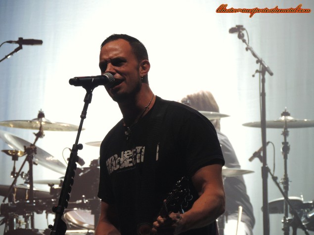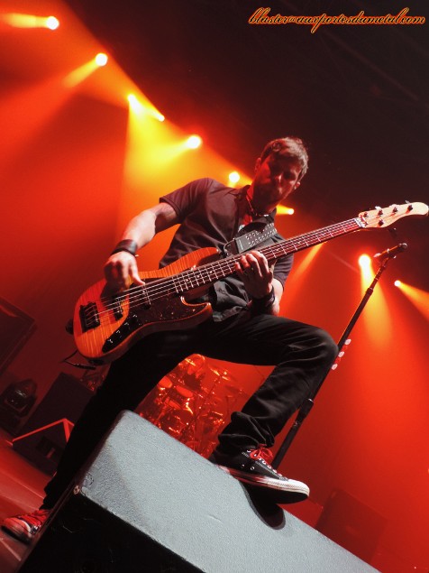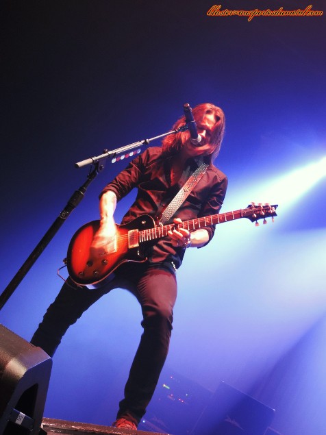 Halestorm a bien chauffé la salle, c'est maintenant à Alter Bridge de faire vibrer le public du Zénith. Histoire de bien commencer leur set, les Américains choisissent le percutant single de leur tout nouvel album Fortress, l'excellent Addicted To Chaos. C'est vrai qu'avec un riff aussi metal et un tempo aussi enlevé, on n'a pas besoin de plusieurs titres pour se mettre dans l'ambiance. Excellente entrée en matière, donc. Cependant, Alter Bridge ne choisit pas de balancer un maximum de nouveaux titres dès le début et préfère servir à ses fans quelques compos plus anciennes, probablement de sorte à ce qu'ils se sentent en terrain connu. Et pour bien faire les choses et s'assurer un soutien indéfectible pour le restant de la soirée, quoi de mieux que de piocher dans l'album référence (enfin, peut-être cela va-t-il changer une fois que l'excellentissime Fortress aura été digéré), le fameux Blackbird ? C'est ainsi que se succèdent pas moins de quatre titres extraits de ce disque : White Knuckles, Come To Life, Before Tomorrow et Brand New Start. Le son est pas mal, même si la section rythmique et la voix de Myles Kennedy sont un peu mieux servies que les guitares, pas absentes du tout mais plus brouillonnes. Quand on connait bien les morceaux, ce n'est pas très gênant mais pour ceux qui découvrent certaines chansons ce soir, je pense que quelques riffs ne sont pas forcément toujours faciles à distinguer. Rien à redire sur les lumières de toute beauté qui permettent au groupe de proposer un show agréable à regarder (et à photographier) malgré la très grande simplicité ou sobriété (certains préféreront le terme "pauvreté") du visuel proposé sur scène... vu qu'il n'y en a pas (à par les musiciens, bien sûr). Pas de backdrop du nouvel album, même pas un petit logo Alter Bridge suspendu dans le fond... rien, nada. En même temps, on n'est pas venu ici pour contempler un tableau mais bien pour se prendre une bonne grose dose de metal dans la tête, n'est-ce pas ? Oui, l'essentiel est ailleurs... C'est bien la musique qui prime, et sur ce point, pas de problème, le contrat est rempli. La présentation du nouvel album reprendra son cours avec Cry Of Achilles en sixième position dans la setlist. Quel bonheur ! D'ailleurs, le public ne s'y trompe pas et tape en rythme dans ses mains pendant que Myles joue l'intro du morceau. Cette chanson est un hymne, c'est déjà assez évident sur album et parfaitement indiscutable en live avec cet excellent refrain dont la dimension épique est décuplée... grâce à la participation bienvenue des fans. S'en suit un autre morceau bien mélodique et fédérateur : Ghosts Of Days Gone By. Le set est bien équilibré et veille à alterner les plages plus mélodiques comme ce dernier titre et d'autres compos plus énervées... La preuve, le titre suivant n'est autre que Ties That Bind, pas vraiment une ballade, vous en conviendrez. A ce moment-là de la soirée, quelques surprises vont avoir lieu. La première : un titre chanté par Mark Tremonti lui-même. La chanson est Waters Rising, logique puisque c'est celle que le guitariste chante sur le dernier album. Très bon moment. Le bougre s'en sort bien et fait le modeste en remerciant le public avec les mots suivants "you make me feel special". Myles rétorquera "mais c'est parce que tu l'es" (spécial, pour ceux qui ne suivent pas). Mignon, non ? Ou alors, c'était une vanne... En tout cas, ça a l'air de les amuser. On rigolera moins avec les titres suivants, l'émouvante Broken Wings fait toujours sont petit effet, son intro est d'ailleurs acclamée par les fans. Sur ce titre, Myles abandonne sa guitare et fait chanter un public chaleureux, ce genre de public à qui il n'est pas nécessaire de demander deux fois de participer. Le groupe aimant toujours alterner le chaud et le froid, c'est donc Metalingus, une des compos les plus bastonnantes de la soirée, qui se glisse juste après... Logiquement, la prochaine chanson devrait être moins remuante. Gagné, c'est la très classe Blackbird qui vient calmer l'assistance. Encore un grand moment. Après un passage plus doux et touchant avec un joli duo entre Myles et Lzzy Hale sur la ballade acoustique Watch Over You (deuxième surprise), un nouvel extrait de Fortress nous est proposé, et pas des moindres puisqu'il s'agit de la géniale Calm The Fire... jouée pour la première fois sur cette tournée, s'il vous plait ! Troisième surprise, donc. Je jubile parce qu'il s'agit vraiment d'une de mes chansons préférées et je ne pensais pas l'entendre ce soir. Vraisemblablement, après avoir observé la foule autour de moi, je ne suis pas le seul à apprécier... La fin du concert se fera avec l'aide de morceaux ayant déjà faits leurs preuves. Le classique Rise Today d'abord, juste avant que le groupe ne quitte la scène. Puis, Slip Into The Void, Isolation et Open Your Eyes en guise de rappel. Verdict : belle soirée ! Le concert aura duré une heure et quarante-cinq minutes et Alter Bridge aura ravi l'assistance avec une sélection de ses meilleures chansons, parfaitement interprétées de surcroît (Mr. Kennedy est vraiment un bon chanteur, pour ceux qui en doutaient). Dommage que le Zénith n'ait pas été rempli... Enfin, pour les absents surtout (qui ont toujours tort de toute façon, non ?), car cela nous a permis de passer une soirée un peu plus intimiste, dans un Zénith en petite configuration. Résumons : merci les absents, merci Alter Bridge, et un grand merci à Karine et Manon de Roadrunner pour les accréditations et le pass photo. Setlist Alter Bridge : 01. Addicted To Chaos