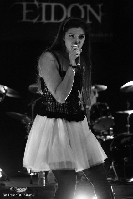 C'est un peu par hasard, un surfant sur un réseau social bien connu, que j'ai appris que le groupe Arcania passait près de chez moi. Je l'ai découvert il y a maintenant plusieurs mois et c'est avec plaisir que je m'écoutais leur album Sweet Angel Dust sur les sites de streaming, alors quand l'occasion s'est portée à moi de les voir, je ne l'ai bien sûr pas ratée ! En regardant l'affiche, je vais écouter sur internet ce qui peut se trouver sur les premières parties et je m'en retrouve d'autant plus alléché. Ainsi donc, je me rends sous le déluge à Tours et déniche la salle, mise à l'écart par quelques travaux. La soirée commence avec Eidon. Ce groupe officie dans le metal symphonique, j'en ai raté la première moitié pendant que j'interviewais Arcania, mais quand je suis arrivé dans la fosse l'ambiance était un peu froide... C'est la triste réalité des premières parties, quand le public ne connaît pas et/où s'en fout. Dommage car les morceaux étaient sympathiques et auraient pu prêter au headbang si le public avait été moins timide. La chanteuse bénéficiait d'une bonne voix lyrique, mais l'effet retombait lorsqu'elle hurlait (rarement). J'ai aussi noté que le son était assez étouffé, on ne distinguait pas nettement tous les instruments. Les musiciens quant à eux étaient assez timides visiblement, et leur prestation, quoi que tout à fait carrée, manquait de vie. Seule la chanteuse se démenait pour faire bouger le public et ses collègues, et c'est tout à son honneur ! Du coup, je pense aussi que la salle était trop grande, le public était vraiment dispersé, et ça n'a pas aidé le groupe pour que celui ci s'approche de la scène... Je souhaite vraiment à ce groupe de jouer dans des meilleures conditions : avec un public plus réceptif qui connaît les morceaux, un meilleur son et alors à ce moment leurs concerts y gagneront beaucoup !