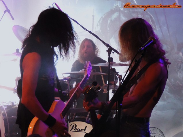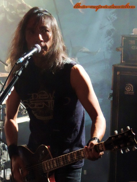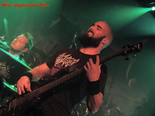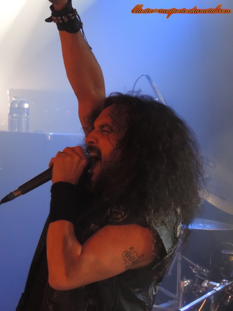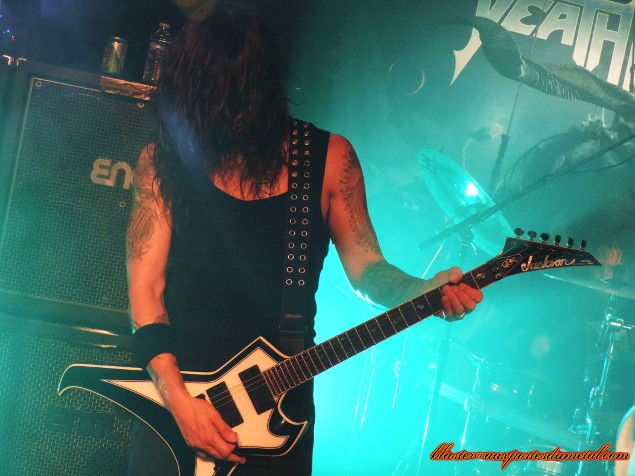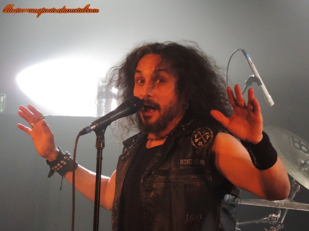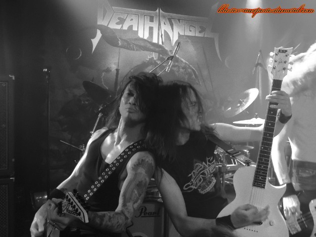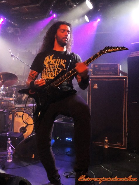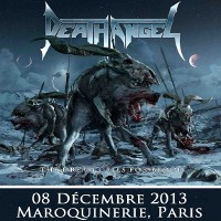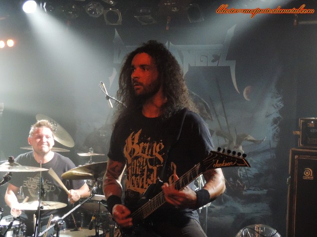 Death Angel est un très bon groupe de thrash... Pas forcément le plus populaire, pas celui qui fait le plus parler de lui, c'est vrai, mais ô combien attachant quand on prend la peine de se pencher sur son cas. Evidemment, tous leurs albums ne font pas l'unanimité et le groupe a connu des hauts et des bas, mais s'il y a un point sur lequel s'accordent les personnes qui ont été témoins d'un de leur concerts, c'est bien que, sur scène, Death Angel tue. Alors quand un groupe doté d'une réputation aussi solide se pointe sur Paris et qu'en plus, The Dream Calls For Blood, leur dernier album en date est l'un des disques les plus réussis et agressifs de leur discographie, que fait-on ? Question rhétorique, on y va bien sûr... d'autant plus que le concert a lieu à La Maroquinerie, petite salle intimiste idéale pour ce genre de rendez-vous. Ce soir, les thrashers californiens ne sont évidemment pas venus seuls. Extrema et Adimiron eurent la tâche de faire démarrer la soirée... mais je ne pourrai rien vous en dire, et cela pour deux raisons : d'abord, parce que la soirée commenca bien avant l'heure annoncée sur le billet ou sur différents sites censés relayer les infos concernant les horaires et, ensuite (et surtout), parce que pendant une bonne partie du temps pendant lesquels ces deux groupes se produisaient, j'étais en pleine interview avec le très loquace Rob Cavestany, éminent guitariste / fondateur de Death Angel. Passons donc directement au groupe suivant : Dew-Scented. Dew-Scented est un groupe que je ne connais que très peu. Je n'aborde donc pas le show en tant que fan mais plus en curieux. Et, rapidement, je dois reconnaître que ça passe plutôt pas mal. Leur thrash/death est rapide et assez dévastateur. Les gars maîtrisent leur art, pas de souci là-dessus, ça joue vite, fort et précis. Le set s'articule principalement autour de trois albums. Trois titres (Sworn To Obey, Storm Within et Thrown To The Lions) sont extraits du récent Icarus (sorti en 2012), trois autres (Soul Poison, Cities Of The Dead et Acts Of Rage) proviennent du plus ancien Impact sorti il y a dix ans, et deux autres morceaux (Turn To Ash et Never To Return) nous viennent directement de Issue VI (2005). Une partie de la foule se montre très réceptive aux show carré proposé par les Allemands. Quelques fans bougent bien et quelques stage-divings ont lieu. Pendant ce temps, le groupe défouraille avec précision. Un bémol pour le novice que je suis : je trouve leur musique efficace, certes, mais assez linéaire et finalement un brin répétitive. C'est bien simple, à un moment, je n'étais plus très sûr de savoir si l'on était toujours sur le même morceau ou si l'on était passé au suivant. Ma méconnaissance du sujet est probablement à blâmer, c'est sûr, mais je ne pense vraiment pas qu'elle soit la seule cause de cette hésitation. Je n'ai pas pu m'empêcher de penser à une scène du film Didier d'Alain Chabat où un groupe de skinheads zappent les pistes d'un CD dans leur voiture ("Mets la trois... nan, la trois... ça c'est la sept... c'est la meilleure de l'album !") alors qu'il s'agit toujours de la même chanson. J'exagère un peu évidemment, mais j'y ai quand même pensé... Setlist de Dew-Scented : 01. Sworn To Obey Néanmoins, le concert fut costaud et assez court... je ne suis donc pas devenu fan de Dew-Scented mais n'ai pas détesté non plus. Je suis sûr que j'aurais plus apprécié le concert si j'avais mieux connu la musique du groupe... De toute façon, je ne vais pas vous mentir, c'est bel et bien pour Death Angel que je me suis déplacé ce soir. Et là, point de déception ou de regrets, comme on pouvait s'y attendre, ce fut la grosse claque ! Comme je le disais un peu plus haut, sur scène Death Angel est un groupe qui assure, impressionne et donne tout. En tout cas, c'est le souvenir que j'en avais (souvenir partagé par toutes les personnes avec qui j'ai discuté de ce groupe ces dernières années) avant que le set de La Maroquinerie ne démarre. Un moment d'hésitation s'empare de moi à quelques secondes du début des hostilités... Et si j'avais un peu embelli la réalité ? Et même sans aller jusque-là, peut-être que les Californiens ont pris un petit coup de vieux... Oui, la dernière fois que je les ai vus, c'était quand même en 2004, au Wacken Open Air (voilà qui ne nous rajeunit pas). Ne se pourrait-il pas, qu'en un peu plus de neuf ans, ces messieurs aient un peu perdu de leur hargne ? Bon, et bien après s'être pris Left For Dead et Son Of The Morning, les deux premiers titres de The Dream Calls For Blood dans la tête, la réponse est : non, la hargne est toujours là ! Les Death Angel ont de la fougue à revendre. En plus de se montrer particulièrement énergiques et sympathiques, nos amis thrasheurs redonnent toute sa signification à la phrase "être fier de son nouvel album". Alors que beaucoup de groupes actuels préfèrent se reposer sur les valeurs sûres, les chansons qui ont déjà bien fait leurs preuves pendant des années, Death Angel balance énormément de morceaux récents, quitte à un peu laisser de côté les albums cultes des débuts. Cela dit, on n'a vraiment pas envie de se plaindre, les nouvelles compos sont redoutables sur scène. Et celles de l'album précédent également. D'ailleurs sur les dix premiers titres joués, deux seulement appartiennent aux premières heures du groupe (Mistress of Pain et Seemingly Endless Time), tout le reste provient de The Dream Calls For Blood et Relentless Retribution. En tout cas, quelque soit l'époque dont proviennent les différents titres proposés, le point commun est facile à trouver : la patate ! Très de peu de mid-tempos ou d'accalmies ce soir, le groupe a décidé de miser sur une musique rapide et rentre-dedans. Le public exulte et les pogos se font fréquents dans une fosse remontée à bloc... mais qui garde le sourire ! Les points forts du groupe sont nombr