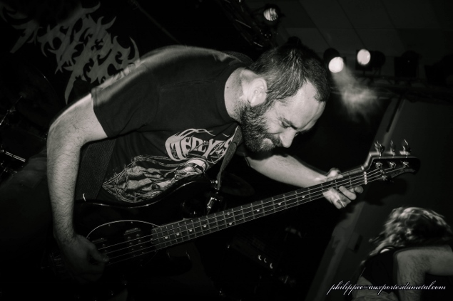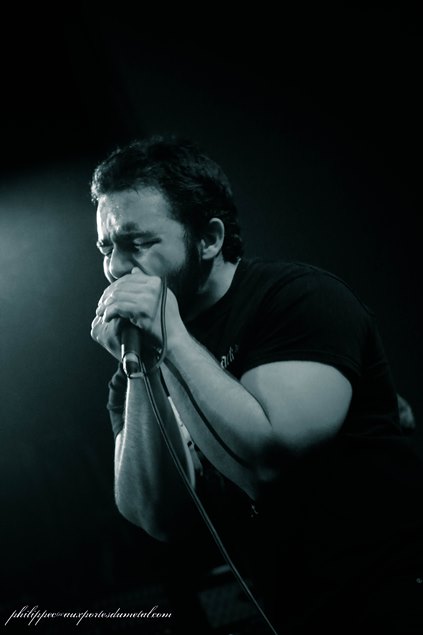 Mais il est encore dommage que le chanteur soit inaudible, car ce géant aux allures de Peter Steele ( Type of Negative) a une belle présence scénique. Les problèmes liés au son plombent un peu le set de ce groupe toulonnais fondé en 2009 : le batteur, à cause de soucis de retour, n’était pas “in sync” avec ses pieds. Désolé les gars, mais du coup ayant un peu décroché, nous en avons, Philippe et moi, profité pour aller manger. Setlist de Brutal Advengers : Destructipn of the sick by the fallen angel commando 3- Affliction Gate Nous sommes de retour dans la salle nous avons raté une partie du set d'Affliction Gate qui relève le niveau (le son est meilleur). Il joue du death un peu classique sans grand déballage de technique, à la Obituary qui rencontre Paradise Lost. A souligner, ce groupe est le premier à avoir un line-up classique (deux guitaristes, un bassiste, un batteur, un chanteur). Le set fait très professionnel. A noter que c’est le batteur de Mercyless (Laurent Michalak) qui est aux fûts avec eux pendant tout le set.