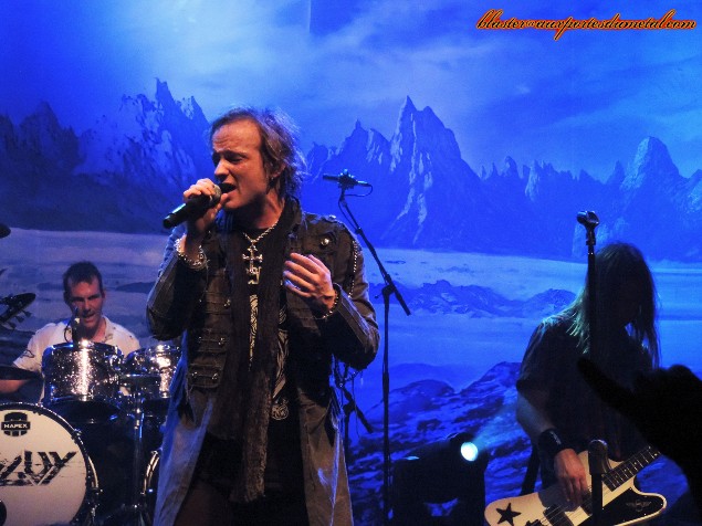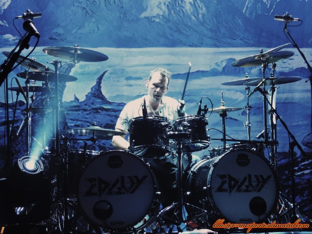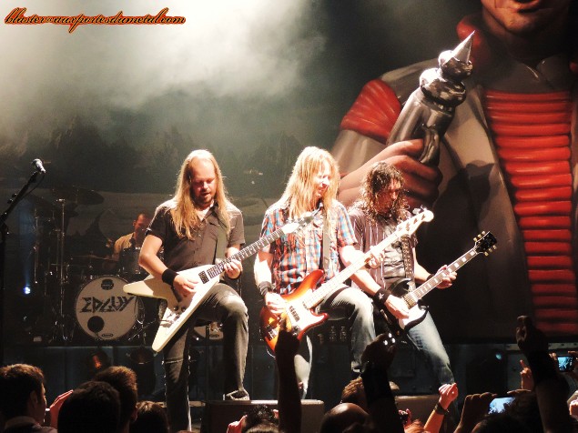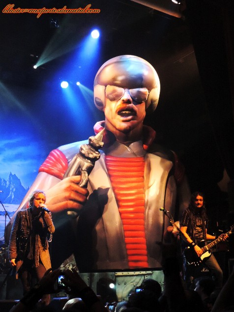 Quand les lumières s'éteignent à nouveau, après une petite pause d'une demi-heure, l'enthousiame des fans se manifeste à travers une acclamation telle qu'on se demande si le toit de la Cigale va tenir. Felix Bohnke s'installe derrière sa batterie, bientôt rejoint par les autres musiciens du groupe, chaque nouvelle arrivée provoquant les cris d'un public plus que chaleureux. Le concert démarre ainsi, avec un morceau aussi enjoué que les fans eux-mêmes : Love Tyger. Pas tout à fait la grosse claque heavy à laquelle on pourrait s'attendre pour lancer un show mais un choix qui se défend et qui ne manque pas de séduire l'assistance qui bouge et assiste Tobias Sammet sur le refrain. L'ambiance ne redescend pas avec l'énergique Out Of Vogue rescapée de l'album Rocket Ride. Même constat avec Ministry Of Saints, pourtant pas la chanson la plus remarquable de la carrière des Allemands (remarque qu'on peut étendre à l'album dont elle est extraite, le moyen Tinnitus Sanctus). Le devant de la fosse saute sur place comme un seul homme monté sur ressorts. L'impression que j'ai à ce moment de la soirée est qu'Edguy peut bien balancer ce qu'il veut, le public lui mange dans la main et se régale. Il faut dire que le groupe est toujours aussi efficace et sympathique en concert... Et Tobias Sammet est probablement l'un des frontmen les plus charismatiques de sa génération, ce qui ne gâte rien. J'affirme cela avec objectivité et ceux qui me connaissent pourront en attester tant ils savent que Sammet est loin d'être, sur album, mon chanteur préféré. Sur scène, le bonhomme est excellent et son humour est toujours aussi appréciable. La quatrième chanson de la soirée n'est autre que Superheroes. Vraiment loin d'être ma compo préférée d'Edguy. Peu importe, c'est fun et entraînant, le public chante le refrain à tue-tête et je n'arrive pas à résister. En plus, le discours de Tobias juste avant que le morceau démarre m'a bien fait rire. En gros, il a pris son temps (deux bonnes minutes, il me semble) pour nous expliquer que la chanson qu'ils allaient jouer était dédiée à quelqu'un de très important pour lui, d'incroyablement talentueux et pas forcément reconnu comme le génie qu'il était (je vous passe les détails)... lui-même ! Fun. A ce moment-là, je m'interroge quant au choix des chansons pour la setlist 2014. Love Tyger, plus hard rock que metal, Out Of Vogue et Superheroes, pareil... et toutes deux extraites de Rocket Ride, avec une Ministry Of Saints au milieu... C'est sympa mais quand même pas renversant. Edguy semble vouloir privilégier le fun et met en avant des compos "single"... mais j'aimerais bien entendre autre chose... quelque chose de plus consistant, de plus classe ou épique. Un bon classique échappé de l'époque Vain Glory Opera - Theater Of Salvation - Mandrake, ferait tout à fait l'affaire. Patience, ce n'est pas encore le moment, Tobias nous annonce qu'ils vont jouer une compo du nouvel album... Le discours de Sammet qui précède la nouvelle chanson sur le point d'être jouée est encore excellent. Il nous dit qu'ils sont venus nous présenter leur nouvel album mais juge que l'accueil du public n'est pas assez délirant... C'est alors qu'il attire notre attention sur des micros placés sur les côtés de la scène, micros présents pour nous enregistrer. Le public était chaud, il est maintenant bouillant. La chanson Defenders Of The Crown passe très bien en concert. Tempo enlevé, double grosse caisse de sortie, riff épique et passage idéal (avant le dernier refrain) tout en "oh oh ohohohoh ohoho" pour faire chanter les fans... carton plein. Et la fête continue avec Vain Glory Opera qui ravit notamment ceux qui, comme moi, ont connu le Edguy de cette époque (en 1998... ça ne nous rajeunit pas). Ensuite, c'est l'heure du solo de batterie. Un peu long (comme celui dispensé il y a trois ans au Bataclan), mais fun, bien dans l'esprit du groupe avec, par exemple, une introduction jouée à la flûte par Felix lui-même sur le thème de la 20th Century Fox. Ensuite il accompagne la bande qui joue la Marche Impériale (thème du film StarWars) avant de se lancer dans une démonstration plus classique. Quand Tobias revient sur scène, c'est pour crier dans son micro que ce n'est pas n'importe qui qui vient de s'agiter derrière sa batterie mais... le batteur !! Bien vu. La soirée se déroule dans la bonne humeur. Le son est bon mais pas exceptionnel, un poil fort et aigu avec une batterie un peu trop en avant (le son de caisse claire surtout) alors que j'aurais préféré mieux entendre les guitares... mais ça passe. Et puis, l'ambiance est tellement délirante... Tobias, pourtant habitué à ce type d'accueil (et pas que chez nous), n'arrêtera pas de s'en étonner et de nous remercier. Après la chanson Space Police, avec son refrain taillé pour la scène et la présence du (énorme) space policeman (gonflable) de la pochette (gimmick très 80's qui fait bien entendu penser à Iron Maiden et son Eddie), le chanteur nous annonce que nous sommes tellement incroyables ce soir qu'ils vont même ajouter une chanson qui n'était pas prévue dans la setlist (et pour avoir jeté un oeil à la fameuse setlist après le concert, je peux vous dire qu'il n'a pas menti) : la très Helloweenienne Babylon. Génial. Et pas seulement parce que ce fut quasiment la seule occasion de se rappeler qu'Edguy a fait du speed mélodique un jour. En guise de final à cet intermède speedé, le groupe enchaîne avec la fameuse "Marche des Gendarmes" (preuve du lien particulier qui unit le groupe allemand et notre pays) et un petit bout de The Trooper de vous avez plutôt intérêt à savoir qui. Tout ça ne permet pas à La Cigale de se calmer... au contraire. La reprise de Falco (Rock Me Amadeus) est jouée, puis un petit retour vers le passé s'opère avec la ballade Land Of The Miracle (véritable faux pas setlistique pour les oreilles de votre servite