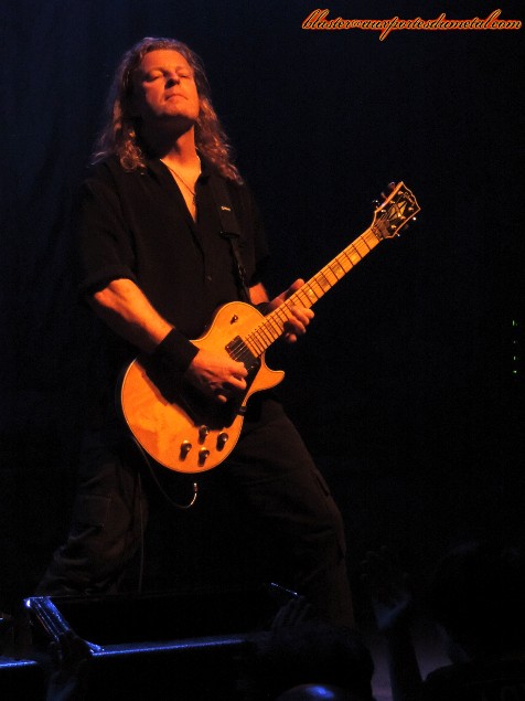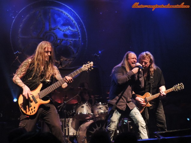Une dernière date de tournée européenne peut augurer d'une soirée festive... c'est en tout cas ce que je me suis dit en me rendant à la Cigale le 22 octobre dernier pour y retrouver les fameux Edguy accompagnés pour l'occasion de Masterplan. Le moins que je puisse en dire maintenant est que je ne m'étais pas trompé. Les premiers mots qui me viennent à l'esprit quand je me remémore la performance du quintet allemand venu présenter son Space Police à ses fans sont : "ambiance de folie ". Avant de revenir sur ce concert on ne peut plus fun, commençons par le début de la soirée avec Masterplan qui, s'il n'a pas complètement retourné le public parisien et ne peut prétendre rivaliser avec la bande à Sammet (en termes de popularité ou de charisme sur scène), a livré un concert de cinquante minutes franchement plaisant, à défaut d'être inoubliable. L'intro du dernier album retentit dans les enceintes pendant que les musiciens prennent place mais ce n'est pas The Game qui déboule comme c'est le cas sur Novum Initium mais le tout premier single sorti par le groupe il y a douze ans de cela, j'ai nommé (l'excellent) Enlighten Me ! Le son n'est pas encore très équilibré à ce moment du show (comme c'est souvent le cas en tout début de concert) et quelques réglages sont nécessaires pour qu'on entende bien chaque intervenant mais la compo passe bien, surtout auprès de ceux (qui se sont pressés dans les premiers rangs) à qui elle rappelle de bons souvenirs. On reste sur radio nostalgie avec le deuxième titre de la soirée, Heroes, lui aussi extrait du premier album de Masterplan. Le groupe semble content d'être là, c'est sa dernière date avec Edguy ce soir. Alors que Roland Grapow est plutôt sobre et posé, le claviériste Axel Mackenrott a l'air bien décidé à faire la fête, il bouge beaucoup, brandit régulièrement une bière vers le ciel (avant de la vider) et chante à s'en décrocher la machoire derrière son clavier. Un enthousiasme qui fait plaisir à voir. Rick Altzi est vocalement assez proche de Jorn Lande, en moins impressionnant, il est vrai. Dur de passer après un tel monstre. Cependant, si Jorn ne saurait être égalé sur un plan strictement vocal, il n'en va pas de même pour ce qui est de la prestation scénique. Rick n'est certes pas le frontman du siècle (et la comparaison obligée avec Tobias Sammet qui montera sur les planches de La Cigale un peu plus tard n'aide pas) mais il dégage tout de même quelque chose de plus que son prédécesseur globalement très ennuyeux à regarder sur scène. Sans atteindre des sommets, Altzi est un peu plus sympa et chaleureux, accordons-lui cela. Les interventions du vocaliste tournent globalement autour du fait qu'il fait chaud et qu'il faut bien s'hydrater... à la bière. Dans la fosse, quelques fans expriment leur approbation. Revenons à la musique : après deux premières chansons nous remémorant les débuts du combo, on change d'album (on passe à Aeronautics) avec la puissante Crimson Rider balancée par un groupe carré. Il faut dire que la section rythmique tenue par Jari Kainulainen (pas le moins compétent des bassistes, vous en conviendrez) et un jeune homme qui remplace Martin Skaroupka à la batterie est super solide ! Le batteur (dont le nom m'a malheureusement échappé) est en grande forme et en rajoute un peu partout. Déjà, les parties sur album ne sont pas à la portée de tout le monde mais là, comme si ça ne suffisait pas, le gars remet quelques roulements supplémentaires, un ou deux contretemps quand ça l'amuse et un peu de rab de double pédale ou de cymbales histoire de ne pas s'endormir. Après avoir proposé le single extrait de son dernier opus, le sympa mais pas dément Keep Your Dream Alive, le groupe revient à son premier disque et balance un Crystal Nights heavy en diable. Grosse accélération de tempo avec la speed Spirit Never Dies qui est très convaincante en live. Je n'en dirais pas autant de Soulburn, que j'aime pourtant beaucoup sur disque, mais qui a plus de mal à prendre son envol ce soir. Peu importe, l'excellente Kind Hearted Light et la puissante Crawling From Hell viennent immédiatement me réveiller et offrent un final rythmé aux mélodies accrocheuses. Aveu d'échec (ou pas) de la part d'un groupe qui peine à s'attirer la reconnaissance avec ses sorties récentes, les nouvelles chansons sont étrangement absentes de la setlist. Il est étonnant de constater que sur les neuf titres joués ce soir, sept proviennent du premier album du groupe... contre un seul extrait du plus récent (et pourtant loin d'être mauvais) Novum Initium ! C'est ainsi... et rien ne sert de bouder son plaisir puisqu'après tout, les chansons choisies sont, pour la plupart d'entre-elles, de très bonnes compos qui se révèlent particulièrement efficaces sur scène. Reste que, malgré une prestation sympathique de la part de ces musiciens de haut niveau, il manque tout de même à Masterplan quelque chose qui lui permette de complètement me convaincre. J'ai quand même bien apprécié ce concert. Cela m'a fait plaisir de revoir Mr. Grapow sur scène et j'ai pu mesurer les progrès faits depuis cette fameuse année 2005 où le combo, mené par Jorn Lande à l'époque, s'était produit au Trabendo et révélé assez ennuyeux. Là, sans parler de folie, c'était plus sympa et décontracté. Les membres du groupe terminent leur set avec le sourire aux lèvres, après que Rick Altzi a bien fait chanté la salle sur le break de Crawling From Hell et a présenté les autres membres du groupe, non sans une petite pointe d'humour au moment de s'arrêter sur le batteur, précisant (en s'adressant aux jeunes filles de l'assistance) que ce dernier était célibataire. Setlist Masterplan : 01. Intro (Per Aspera Ad Astra)