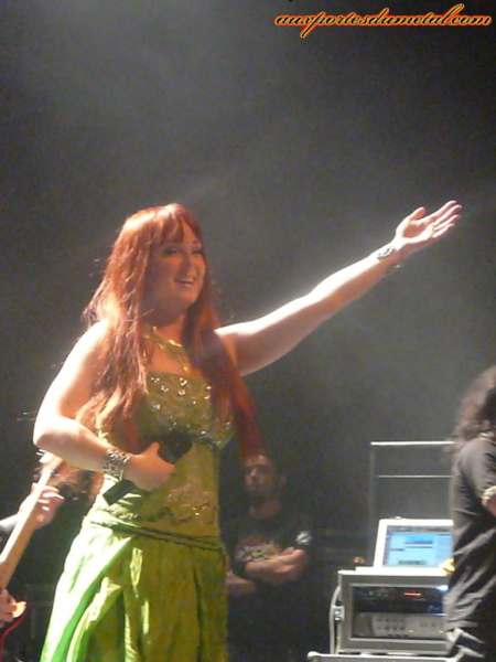 Puis après quelques balances, le second groupe arrive. Une partie du public le connait déjà puisqu'il s'agit d'Amberian Dawn, qui tournait déjà avec Epica lors de la tournée précédente ! Heidi Parviainen toute de vert vêtue (surprise, elle n'est pas habillée en blanc !) se présente devant un public bien plus chaleureux qu'il ne l'était auparavant. Il faut dire que certaines personnes présentes ce soir là, sont venues pour eux ! Comme à son habitude, le combo tout droit venu de Finlande nous offre un set plein d'énergie et d'émotions (quelques ballades ont été intégrées entre les titres plus "speed metal") alliant les morceaux du premier et du second album. Malheureusement, si Heidi assure comme toujours son chant lyrique avec un professionnalisme et un sourire radieux, la pauvre rencontre quelques soucis avec son micro qui n'émet plus aucun son sur l'un des couplets de la chanson Kokko, ou encore qui se retrouve avec une voix couverte par les autres instruments. Et ceci est bien regrettable vu la qualité du show qu'Amberian Dawn nous offre. Les musiciens communiquent avec le public, s'en donnent à coeur joie, Tuomas Sëppala nous offre même un petit solo aux claviers (solo que le public du MFVF avait déjà entendu soit dit en passant !). On reprochera une fois de plus à Heidi d'être trop statique, et de partir un peu trop de la scène entre deux interventions vocales. Après un long set, (ils ont joué onze morceaux tout de même !) c’est applaudi par un public majoritairement conquis que la joyeuse bande quitte la scène, laissant les lyonnais trépigner d'impatience à l'idée de revoir enfin, quasiment un an jour pour jour, le groupe de la soirée, Epica !