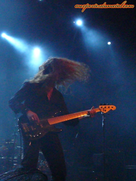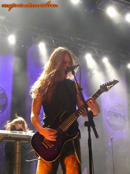 La salle aux lettres bleues accueille donc un petit millier de fans, et par conséquent, nous avons droit à la grande configuration, avec gradins ! Tout le monde se dépêche d'entrer dans la salle et de la remplir ! Et c'est Sons of Seasons qui ouvre la soirée avec son dark metal. Oliver Palotai, fondateur du groupe (et claviériste de Kamelot) s'occupe des claviers mais aussi de la guitare ! Et il faut lui reconnaître un talent certain pour le maniement des deux instruments. Par contre, pour ce qui est se mettre en avant et communiquer, il faudra repasser (ses petites mimiques lorsque le chanteur parle ne suffisent pas à donner l'impression qu'il est complètement à l'aise sur scène) ! Le groupe ne cache pas sa joie d'être de la partie, et nous le montre, parfois un peu trop, surtout Henning Basse, le chanteur, qui en fait des tonnes, tombant dans la caricature et flirtant avec un côté malsain peu agréable ! Certains de ces gestes sont même assez déplacés (ce qu'il fait avec son pied de micro par exemple et que je ne détaillerai pas !), son humour assez particulier aura fait rire quelques personnes, mais sans engouement. Cependant, vocalement, l'homme qui est aussi le chanteur de Metalium ne montre aucune faiblesse et donne son maximum, et bien que son attitude ne soit pas au goût de tous, on peut aussi reconnaître qu'il sait utiliser le peu d'espace qui lui est donné. C'est sous des applaudissements mitigés et quelques cris que le groupe quitte la scène.