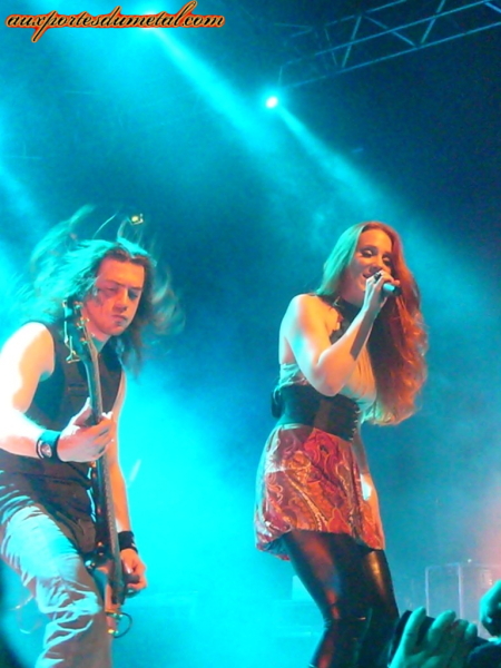 L'excitation monte dans la salle, les premières notes de Samadhi, l'intro du dernier album, Design Your Universe, retentissent ! Et sous les acclamations survoltées du public, les musiciens belges et néerlandais se positionnent ! Resign to Surrender retentit et le public acclame Simone Simons qui fait son entrée sur scène ! La belle néerlandaise semble plutôt en forme bien que l'on entende au début du morceau quelques petits soucis vocaux, et de jolies fausses notes sur la fin du set. Mais on lui pardonne, surtout quand on sait qu'elle a été aphone quelques jours avant ! Simone fait de son mieux, a des regards complices avec le public, des petites mimiques à faire rougir de plaisir le premier rang, occupe la scène comme elle sait le faire, headbang (mais il semble qu'elle le fasse moins qu’avant) etc. Elle boit beaucoup, quitte plus souvent la scène que d'habitude et adresse des petits signes de faiblesse et de fatigue à ses camarades, mais face au public, elle reste souriante et enjouée ! Une bonne comédienne, qui lorsqu'elle se trompe dans les paroles du dernier couplet de Martyr of the Free World prononce un mot en yaourt, puis continue sur sa lancée l'air de rien !