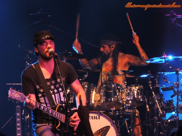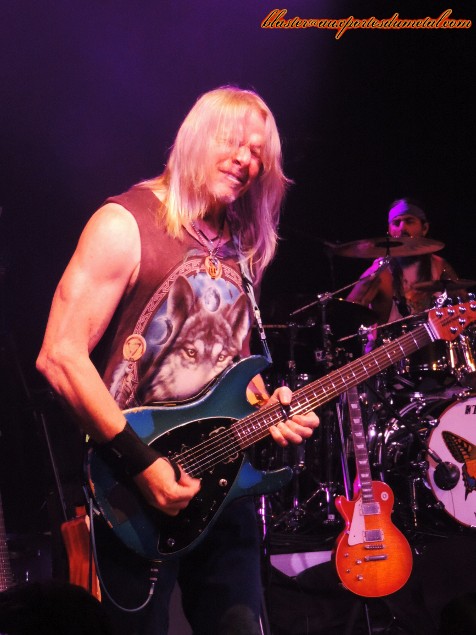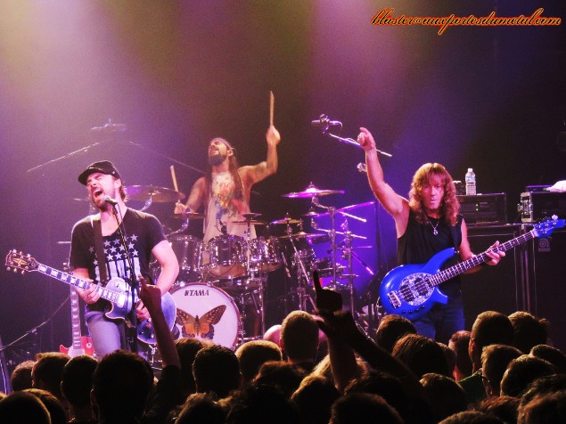 J’en profite pour me glisser vers le devant de la scène, et étant moi-même bassiste, dans l’axe de Dave LaRue. J’espère bien en prendre plein les yeux. La scène est bien lumineuse, la batterie de Mike brille de tous feux. On note la présence de nombreuses GoPro braquées sur les différents musiciens, plus deux cameramen (DVD ?). Steve Morse porte une sorte d’attelle au poing droit, mais son jeu ne semble pas en souffrir. Il est, comme toujours, tout sourire. Mike fait un petit laïus, c’est la dernière date de la tournée. Il fait mine de pleurer pour signifer que la fin de la tournée le rend triste mais reprend le sourire car, dit-il, ce soir ils sont à Paris ! D'après lui, la date a été ajoutée, car la tournée était censée se finir à Londres. "Bouuuhhhh", fait la foule instantanément acquise à la cause des Flying Colors. Il faut dire qu’ils ont de quoi séduire. Le son est parfait, et sur scène on ne sait plus où regarder. Mike Portnoy fait son show, c’est jusque un mec dingue, on l’oublie à chaque fois, mais quelle présence derrière ses fûts ! Tantôt assis, tantôt debout, il gesticule, harangue la foule, saute, chante pas mal de chœurs sur son micro baladeur. Quel personnage ! Si Steve Morse est plus discret, l’indien blanc et blond (enfin, plus trop...) n’est pas en reste. Le regarder jouer ses solos est un pur bonheur. Toujours parfait, archi mélodique, c’est un musicien exceptionnel. Mais de l’autre côté de la scène, c’est tout aussi bien car Dave LaRue n’est pas un simple bassiste, c’est un monstre de bassiste. Il joue principalement aux doigts, quelquefois au médiator (sur Mask Machine), et assure aussi au slap à l'occasion. Le tout sur une superbe basse Musicman quatre cordes, qu’il gardera tout le concert (le mec fait dans le simple). C’est un peu un showcase Musicman ce soir puisque Dave et Steve sont de dignes représentants de la prestigieuse marque. Un peu en retrait et légèrement en hauteur, on retrouve bien sûr Neal Morse, muni de ses claviers et de son Mac posé bien en évidence. Lui et Mike sont en permanence connectés. Ils se regardent, se causent, on sent qu’ils sont vraiment soudés et contents du résultat qu’ils ont devant les yeux. Neal assure beaucoup de chœurs et chante aussi quelques passages et même un morceau complet (A Place In Your World). Moins démonstratif que ses acolytes, il reste un élément essentiel de la formule magique de cette dream team. Les quatres compères encadrent musicalement et physiquement Casey McPherson, le plus jeune et moins connu chanteur du projet. Il est très à l’aise, plus que sur le DVD de la tournée précédente. Il a clairement pris ses marques au sein de ces demi-dieux de la musique. Et sa présence est tout à fait justifiée tant il est excellent chanteur. Sa puissance vocale et ses capacités à varier les tonalités sont énormes. Les monstres ont trouvé leur perle rare. Il joue aussi de temps en temps des rythmiques de guitare et laisse sa guitare dans son dos le reste du temps. Au milieu du set, Mike annonce qu’il laisse la scène à Casey et que le morceau qu’il va jouer est un morceau d’Alpha Rev, le groupe de Casey, et que c’est grâce à cette chanson qu’il a été choisi pour intégrer l’équipe. C’est un titre acoustique sur lequel Casey joue de la guitare et chante à merveille, on pense même à Jeff Buckley en l’écoutant religieusement. Le truc sympa, c’est que Steve puis Neal le rejoignent et enchaînent sur l’intro acoustique de Peaceful Harbor, la salle est sous le charme du chant magnifique de Casey. Sur One Love Forever, Steve, Neal, Casey et Mike se présentent sur le devant de la scène pour une intro acoustique et à trois voix. Ils sont souriants et complices. Avant de regagner son tabouret, Mike fait même un bisous à Casey. Quel coquin, celui-là ! En live, je dois admettre que certains morceaux qui m’avaient moyennement convaincus sont carrément transcendés. C’est notamment le cas du super lourd Bombs Away (joué très tôt dans la soirée, juste après Open Your Eyes), sur lequel la voix de Casey est passée au travers d’effets, ou encore A Place In Your World qui m’a vraiment convaincu. Les morceaux du premier album font l’effet d’une bombe dans la salle qui réagissait déjà bien aux nouvelles chansons. Tout le monde est ravi d’entendre Kayla, par exemple, dont le refrain est repris à tue-tête. The Storm est aussi une véritable tuerie, un pied absolu. Même remarque pour Forever In A Daze et Shoulda, Coulda, Woulda. L’aisance et la maîtrise des musiciens frisent l’insolence, on touche là ce que ce style musical a de meilleur à offrir, sans prise de tête et dans une atmosphère de camaraderie plus qu'agréable. Mike continuera tout le set à faire le pitre, dialoguer à distance avec des personnes du premier rang, à qui il transmet des baguettes, il reste le cœur de ce projet exceptionnel, et la salle est toute entière vouée à sa cause. On le sent même plus à l’aise ou léger, comme soulagé, depuis son départ de Dream Theater. Le groupe termine avec Cosmic Symphony, que j’ai trouvé bien plus cosmique en live que sur album, et Mask Machine qui confirme sur scène son statut de single sur album : énorme ! Les musiciens reviennent rapidement sous les cris de la foule qui en redemande. Le rappel est constitué de Infinite Fire, extrait du premier album, qui permet à la soirée de se finir en apothéose.