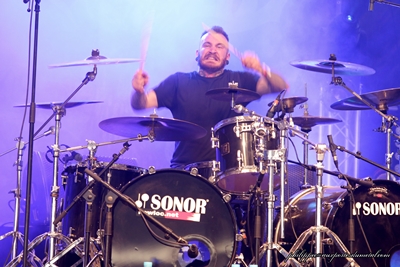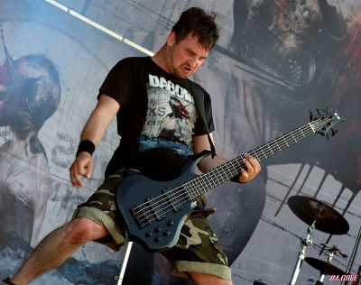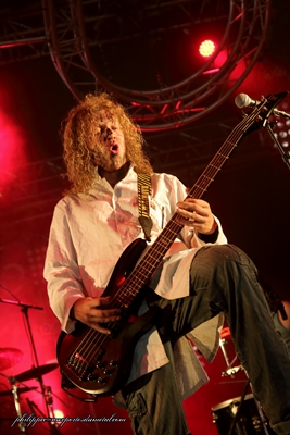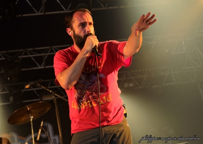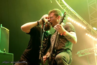 Supuration (The Altar - 13:35) (philippec) L'année dernière sous The Altar, j'assistais à un super concert de The Old Dead Tree qui s'était reformé et pour l'occasion, les Parisiens avaient joué leur premier album en totalité et ce fut un grand moment ! L'organisation nous refait un peu le même coup pour cette édition, puisqu'elle invite le groupe Supuration à jouer sous le même chapîteau leur premier album The Cube en intégralité, au grand bonheur des fans de Supuration, et ils sont nombreux cet après-midi sous The Altar ! Les frères Loez et leur deux compères Frédéric Fievez (Basse) et Thierry Berger (Batterie) se mettent en place sur une scène bien enfumée. Dès que le public les aperçoit, c'est l'ovation. Nous ne sommes pas des milliers par hasard sous cette tente, nous sommes bien là pour voir Supuration ! C'est l'intro de Prélude, Ludo, bras levé, pointe du doigt Thierry qui démarre à cent à l'heure, Ludo est en forme vocalement, pareil pour Fabrice qui fait les chœurs. A la fin du premier titre, nous avons droit à un "Salut Hellfest ça va ?" de la part de Ludovic, nous sommes ravis, puis le groupe enchaîne, on aura droit à peu de paroles entre les titres, mais ce n'est pas grave, Supuration nous tient en haleine avec sa musique. J'ai adoré 1308 JP 08 au relent Voïvodien, The Cube qui suit, puis Through the Transparent Partitions. Ludovic a une sacrée prestance sur ce titre. Ces trois brûlots ont été pour moi un des temps forts de ce set, le quatuor, même si le jeu de scène est assez statique, en impose. Le public est conquis, celui-ci n'est pas simplement hexagonal, les nombreux fans étrangers présents prouvent bien que Supuration est aimé au-delà de nos frontières. The Dim Light raisonne sous The Altar, il signe la fin d'un grand moment du festival. Le public est ravi, le son a été impeccable, les musiciens de Supuration peuvent être fiers de leur prestation ! Ludovic, Fabien, Frédéric, Thierry saluent et remercient leur fans qui ont été nombreux à répondre présent pour communier avec ce grand groupe qu'est Supuration ! Ce concert a été une révélation pour moi et j'ai hâte de féliciter les frères Loez en direct lors de l’entretien que j'aurai avec eux quelques heures plus tard. Setlist Supuration : 01. Prelude Trollfest (The Temple - 14:20) (philippec) A peine le set de Supuration terminé, je me tournais rapidement vers la scène de la Temple déjà archi bondé pour voir les Norvégiens de Trollfest. J'arrive tant bien que mal jusqu'à l'entrée du pit photo. Le public est prêt pour la fête et scande à tue-tête "Trollfest ! Trollfest !"... Le groupe se met en place sur un courte intro, la fiesta peut commencer ! Les musiciens de Trollfest sont tous en blouses blanches comme sur le clip de leur single Kaptein Kaos. En fait c'est avec ce titre qu'ils débutent leur boum géante. Dans le public ça danse déjà, saute, pogote mais avec un esprit de fête et bon enfant. Le groupe enchaine avec Vulkan, un deuxième titre de leur nouvel album, cette compo est enjouée. Les premiers slams commencent à fuser, sur scène aussi ils s'éclatent bien, ils sont une dizaine environ. Plus on est de fou, plus on rit ! On arrive au quatrième titre, une vraie folie furieuse envahit The Temple, une folie qui a pour nom "Toxic", une cover du célèbre titre de Britney Spears. Les slammers se déchaînent, je suis dans le pit, c'est mon troisième Hellfest en tant que photographe et je n'avais jamais vu ça : les gars arrivent par vagues de dix, obligeant le responsable des challengers à fermer l'entrée du pit juste après ce titre laissant quelques regrets aux photographes retardataires. A partir de là, le concert prend une nouvelle dimension le public déborde largement de The Temple. Les challengers ne vont pas chômer dans le pit, ils ont le renfort de leurs potes de The Altar pour les épauler, ils vont chacun prendre des dizaines et des dizaines de fans dans leur bras, les accompagner, les soigner pour certains et toujours avec le sourire. Ce sont des anges gardiens, ces mecs sont indispensables pour que le hellfest se passe bien sur toutes les scènes. Ils sont aussi très sympa ! La fête continue avec Brumlebassen d'abord puis Avé Maria, encore un titre de Kaptein Kaos. Le public reprend le refrain en chœur avec le groupe, on assiste à une vraie furia. Ces mec n'ont pas peur de s'attaquer à tout les styles et surtout d'en ressortir le côté festif comme sur Karve avec son passage gypsy puis sur Solskinnsmedisin, une composition mêlant metal furieux, salsa et samba. Ces deux morceaux me donnent des regrets d'avoir mon appareil ! J'aurais bien tenté un slam pour fêter mon cinquantenaire, ce concert m'a vraiment filé un coup de jeune et une patate d'enfer ! Nos Trolls fous terminent leur show avec Helvetes Hunden Garm qui mettra une dernière fois le feu dans le pit... les slams ne se comptent plus. Heureux d'une telle communion avec le public, les membres de Trollfest à la fin de leur set vont descendre dans le pit pour saluer leur fans. Je pense que ce concert va rester dans les annales du Hellfest et dans le cœur de chaque personne présente sous The Temple, musiciens compris ! Setlist Trollfest : 01. Kaptein Kaos Buckcherry (Mainstage 2 - 14:20) (Didier) Je connaissais assez peu ce combo californien, pourtant je l'avais noté comme incontournable dans mon planning. Je ne regrette pas même si avec le recul, je ne trouve pas grand chose à vous raconter. Ils sont bien de Californie, tout dans leur style nous le rappelle. Même remarque pour le backdrop, qui mentionne leur ville d'origine, Los Angeles. Leur look aussi : veste motard, tee-shirt motard, et surtout une véritable exposition ambulante de tatouages. C'est simple, quand le chanteur a tombé son haut, j'ai cru, de loin, qu'il avait enfilé une chemise bariolée. Il en est entièrement recouvert ! Le chanteur, pas des plus communicatif, assure bien