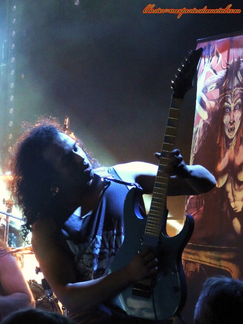 Iced Earth, avec son nouvel album fraîchement sorti sous le bras, dans une petite salle comme le Trabendo... ça se loupe ? Oh que non ! En plus, j'aime les découvertes et comme je ne connais ni Elm Street ou Warbringer, je suis motivé. Malheureusement, pour des raisons diverses et variées, et surtout pas forcément intéressantes pour vous (je vous dispense donc des détails, chers lecteurs) j'ai manqué la plus grande partie du show d'Elm Street, premier groupe à ouvrir le bal ce soir. Cependant, le peu que j'ai pu voir et entendre m'a bien plu. La musique du groupe, à mi-chemin entre heavy metal classique des 80's et thrash de la même époque est plutôt facile d'accès et séduisante sur scène. Cela ne m'a pas semblé d'une grande originalité, le jeune groupe va devoir affirmer davantage sa personnalité à l'avenir, mais la recette est efficace et idéale pour un début de soirée. D'ailleurs, le Trabendo semble globalement conquis, l'ambiance est bonne, le groupe est éminemment sympathique et énergique... aaaahhh, la fougue de la jeunesse. Bref, le court moment (encore plus pour moi que pour les autres qui ont assisté à l'intégralité de la prestation des Australiens) passé en compagnie d'Elm Street fut très agréable. Une petite demi-heure plus tard, ce sont les Américains de Warbringer qui débarquent sur la scène du Trabendo. Et là, niveau brutalité, on monte d'un cran... voire deux... ou trois. Rapide et agressif, le thrash/death de ces messieurs a quelque chose de terriblement frontral et sans concession. C'est direct et efficace, et bien que je ne connaisse aucune compo du groupe, je me laisse gentiment happé par ce set ultra vitaminé. Cependant, je note que l'ensemble manque un peu de variété (et de mélodie, en ce qui me concerne). Le dynamisme des compos et des musiciens fait qu'il est facile de se laisser entraîner. En plus, le vocaliste John Kevill fait bien son boulot de frontman. Niveau chant, c'est très limité, hyper agressif mais pas varié pour deux sous. En revanche, niveau présence et énergie, le monsieur n'a de leçon à recevoir de personne. Son petit truc perso, c'est une gestuelle très "fan des arts martiaux". On a l'impression qu'il fait ses katas face au public, c'est plutôt amusant. A part ça, il indique régulièrement à ses fans, grâce à une gestuelle adéquate, qu'il est temps de relancer quelques pogos ou circle pits. Remarquez, il n'a pas besoin de trop solliciter l'assistance, elle s'active très bien toute seule. Verdict : je n'ai pas envie de me précipiter sur le stand du groupe pour m'acheter leur disque mais leur show fut brutal et bien exécuté. Il est certain que les fans ont apprécié. Setlist Warbringer : 01. Living Weapon