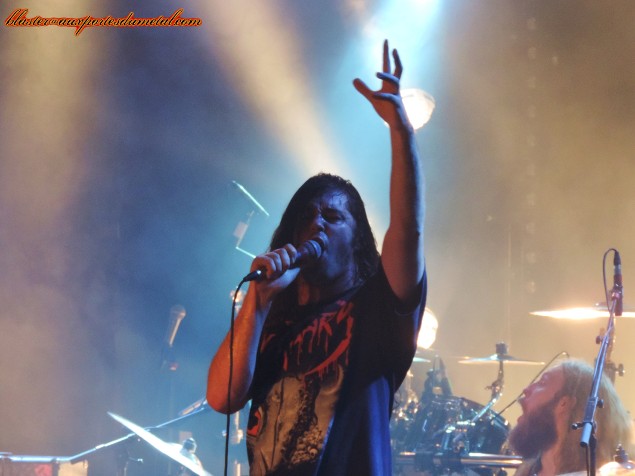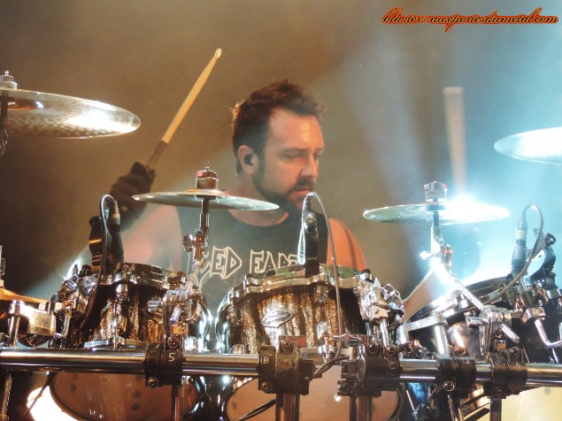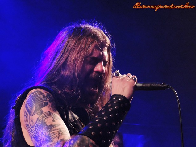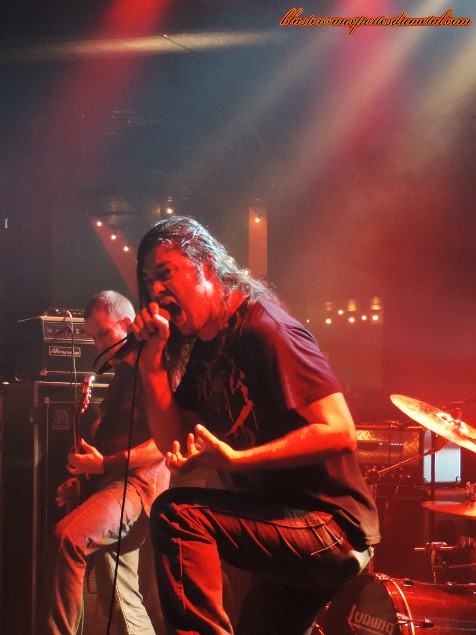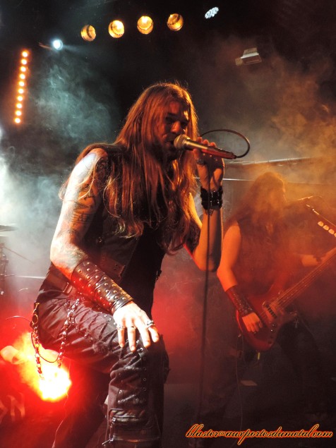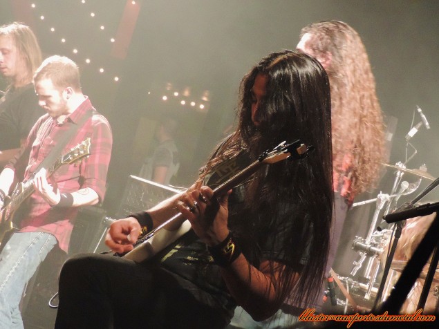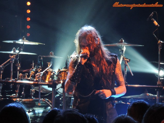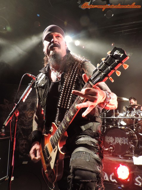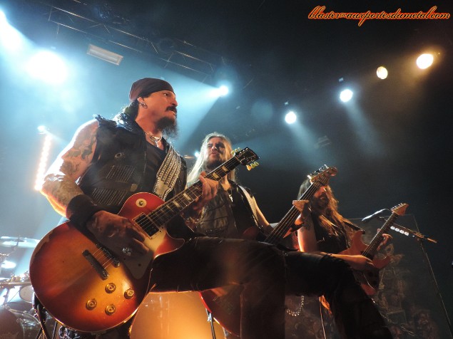 A 21h20, c'est Iced Earth qui investit enfin la scène. C'est pour eux que je suis venu et j'ai hâte de découvrir ce que ces Américains nous ont concocté pour cette nouvelle tournée. Certains d'entre vous ont peut-être eu la chance de les voir en première partie de Volbeat en octobre dernier. En ce qui me concerne, la dernière fois, c'était en novembre 2011 à l'Alhambra. Un très bon concert mais un peu frustant de par sa durée plus courte que sur beaucoup d'autres dates de la tournée de l'époque. Ce soir, le show durera plus d'une heure quarante et comprendra dix-huit titres, c'est bien... même si je remarque que la chanson Pure Evil est barrée sur la setlist scotchée sur scène. Arh, faut toujours qu'on nous enlève un truc !! C'est d'autant plus dommage que cette compo étaient la seule rescapée du classique Night Of The Stormrider. Mais j'arrête de râler... reprenons les choses depuis le début. C'est avec deux titres extraits de leur dernier bébé que Jon Schaffer et ses sbires attaquent leur set. Plagues of Babylon et Democide, on s'en serait douté, passent très bien l'épreuve de la scène et s'avèrent assez redoutables. Le son est fort et puissant. Très... mais pas trop, je n'ai pas les oreilles qui sifflent. Les stars de la soirée, ce sont surtout les guitares, particulièrement bien servies. On entend tout le reste du groupe mais il est vrai que le rendu de l'instrument de prédilection du charismatique Schaffer est tout simplement énorme. Une fois ces deux premières compos passées, on fait un bon de dix-huit ans en arrière avec Dark Saga (tirée de l'album du même nom). Ce titre heavy, mid-tempo et sombre est toujours aussi agréable à entendre... En revanche, la nouvelle ballade If I Could See You, hommage au grand-père de Jon Schaffer, arrive peut-être un peu tôt dans la soirée. Elle n'est pas désagréable du tout... mais un titre aussi soft en quatrième position dans la setlist, c'est un peu étonnant. J'en profite pour ramener ma petite râlerie : il ne fallait pas virer Pure Evil !! Non mais... Ok, j'arrête. Quatre titres joués ce soir... et déjà trois du dernier album en date. Oui, Iced Earth est là pour faire la promo de Plagues Of Babylon, cela n'a rien de surprenant mais il faut reconnaître que pour un album qui vient tout juste de sortir, il est très (voire) trop bien servi... quitte à ce que quelques albums dont les fans auraient aimé entendre quelques extraits soient délaissés. Cela dit, la setlist présentée ce soir a des atouts indéniables. Déjà, beaucoup de nouveauté, ça évite le sentiment de déjà vu (ou de déjà entendu, plutôt). Mais ce n'est pas tout, la surprise ne provient pas que du nouvel album... certaines chansons oubliées depuis longtemps (voire depuis toujours) sont distillées tout au long de la soirée. Parmi elles, quelques tueries comme l'excellente Disciples of the Lie (du non moins excellent Something Wicked This Way Comes) ou Red Baron/Blue Max (extraite de The Glorious Burden). Cette dernière chanson est parfaite en live et s'impose comme une évidence. Mais pourquoi avoir attendu si longtemps avant de la jouer sur scène ? Il faudrait la garder pour les futures tournées... A part ça, le groupe assure. Stu Block est moins grimaçant qu'à ses débuts et adopte ce soir un jeu de scène plus sobre que dans mes souvenirs. Assez en voix dès le début du concert, il sera vocalement de plus en plus à l'aise au fur et à mesure que la soirée se déroule. Il faut bien se chauffer. Luke Appleton à la basse et Troy Seele à la guitare font leur boulot consciencieusement mais sans trop se faire remarquer. Ils ne volent pas la vedette à Jon et Stu, objets de tous les regards. Derrière la batterie, on note tout de même la présence de Jon Dette. Très récemment engagé par le groupe, ce batteur est loin d'être un débutant puisqu'il a déjà joué chez Slayer ou Testament. Evidemment, sa prestation est plus que pro... irréprochable. Parmi les autres chansons jouées ce soir, je retiendrai les épiques (et nouvelles) Cthulhu et The End, autres réussites du nouvel album. De très beaux moments... tout comme la magnifique A Question of Heaven qui, elle aussi, n'avait pas été jouée depuis quelques années. C'est amusant, juste avant que cette dernière ne commence, Stu Block dit qu'il s'agit d'une de ses chansons préférées, qu'il sait que c'est également un classique pour les fans et qu'il nous invite à chanter avec lui... qu'on va s'éclater ("we're gonna have fun" dans le texte). Fun ? A Question of Heaven ? Plusieurs mots me viennent à l'esprit quand je pense à cette compo, mais je n'aurais jamais pensé à l'associer à "fun" ! La soirée avance, l'ambiance est plutôt chaleureuse, le groupe livre une belle prestation... et c'est déjà l'heure du rappel. Celui-ci commence en fanfare avec une Dystopia puissante et excellemment bien chantée par Stu Block. Puis on nous proposera une nouvelle accalmie avec Watching Over Me, toujours un moment sympa en concert (et l'occasion pour les fans de pousser la chansonnette), avant de finir avec l'indétrônable classique qui porte le nom du groupe et clôt de façon traditionnelle les shows d'Iced Earth. Au final, que retenir de cette soirée ? Et bien qu'Iced Earth est une machine de guerre toujours aussi redoutable sur scène. Pas de mauvaise surprise de ce côté-là. En revanche, ces messieurs sont un brin statiques et ce n'est pas la folle communion entre eux (le guitariste Troy Seele a passé la soirée à jouer dans son coin et n'est que très rarement sorti de son petit espace de jeu). On retiendra également que les Américains aiment beaucoup (trop ?) leur dernier album (sept titres de Plagues of Babylon sur dix-huit morceaux joués), et que Stu Block est vraiment un très bon choix de vocaliste pour le groupe (chose dont on s'était déjà rendu compte sur la tournée précédente, mais là ça se confirme). Est-ce que je r