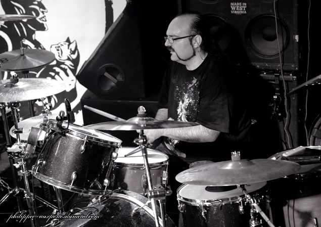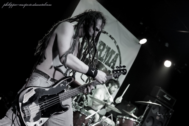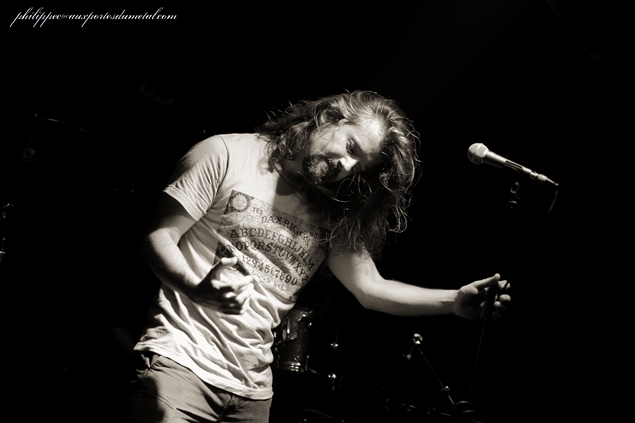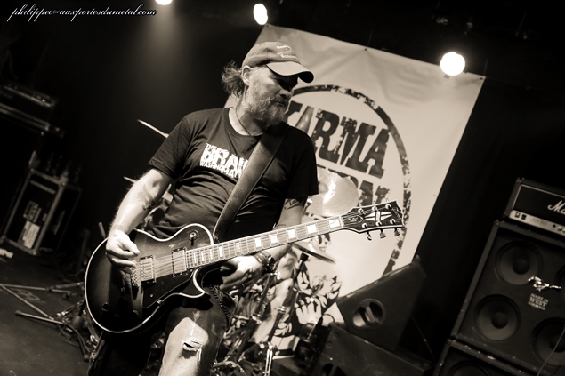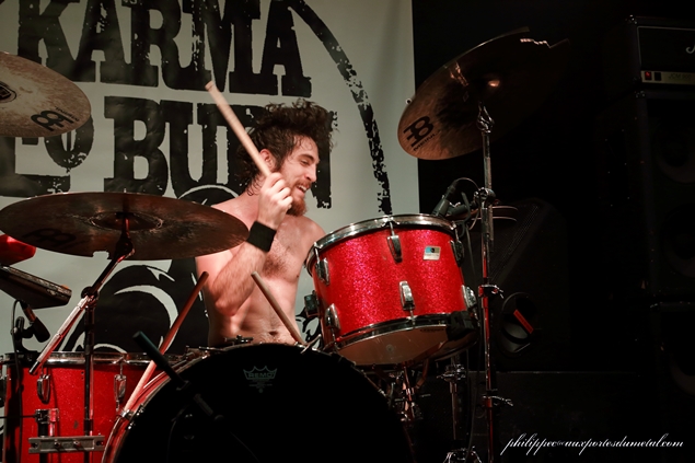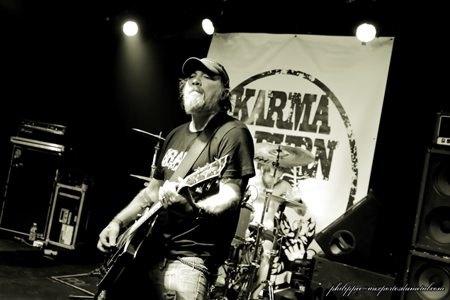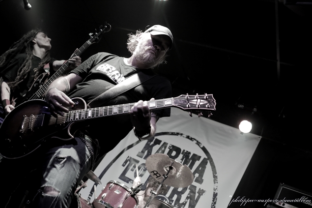 Le mercredi 1er octobre, ne trouvant pas sur la Côte d'usure une salle à la mesure de l'événement, l'association niçoise Caught in Fuzz organisait au Korigan, salle qui se trouve à Luynes (Bouche du Rhône), sa première grosse affiche : le célèbre groupe de stoner instrumental Karma to Burn. Pour cette date, les Américains sont accompagnés du groupe suisse Zlang Zlut et de The Real McCoy venu d'Avignon. La soirée commence par The Real McCoy, un groupe avignonais qui joue dans un répertoire entre doom et stoner et qui a sorti un premier album, Barn Sessions, en 2011 et un split EP avec les Rescue Rangers en 2013 intitulé Split Head. Au premier morceau joué (Flow), on ressent un peu de tatonnement, mais il faut dire que Stéphane (chant), Christophe (guitare), Mirek (basse) et JR (batterie), sortant d'une période de composition et d'enregistrement, n'avaient pas fait de scène depuis quelques temps. En plus, ils nous présentaient une selist composée majoritairement de nouveaux titres (six sur sept) de leur futur album qu'ils sortiront en 2015. Donc cette fébrilité du début peut être assez compréhensible. Au fil du set, The Real McCoy a su accrocher le public pour finalement l'aquérir à sa cause sur les deux derniers titres du set. Tout d'abord avec le seul titre non inédit joué par le groupe ce soir, le brûlot Jokers And Clowns (extrait de Split Head) qui fit bien monter la température puis pour finir le prometteur The Distance que j'ai hâte d'entendre sur CD. Malgré les petits couacs de départ, le groupe s'en sort avec les honneurs, il a su tout de même avec sa musique capter une grande partie du public présent. The Real McCoy peut passer fièrement le flambeau au petit suisse Zlang Zlut. Setlist The Real McCoy : 01. Flow Zlang Zlut est un groupe (enfin un duo) de Heavy rock'n' roll créé à Bâle par Fran Lorkovic (chant/batterie) et Beat Schneider (violoncelliste/choeur), tous deux originaires de Berne. Une partie de l’originalité de ce duo tient dans la rencontre de deux hommes qui viennent d'univers musicaux tout à fait différents. D’un côté Fran est issu de la scène rock et de l’autre, Beat, lui, a été membre de la Camereta de Berne, une célèbre formation de musique classique bernoise. Mais même s'il a une formation classique, en cherchant un peu dans la biographie de ce dernier, on s'aperçoit qu'il a également joué avec Stephan Eicher et qu'il a participé à divers projets punk et pop. Parlons de leur musique. La batterie mène le tempo (souvent effréné), il faut dire que le jeu très énergique de Fran rappelle celui de Don Brewer (Grand Funk Railroad) et de Gil Moore (Triumph), deux très bons batteurs qui officient dans des groupes à la musique très organique en live et qui, comme lui, sont aussi deux très bons chanteurs. Le violoncelle électrique associé à des pédales d’effets a un son proche d’une guitare électrique, les riffs sortis sont bien tranchants, mais lors des soli, l'instrument est bien reconnaissable car on distingue clairement le frotté des cordes par l'archer de ce diable de Beat. Les deux instruments combinés donnent un Heavy rock énergique et groovy dont le résultat sur scène est bluffant. Dès le premier titre joué (Flood), on sent bien que ce duo est plus que complémentaire, il est fusionnel ! Le répertoire de Zlang Zlut tient sur des compos simples qui ont une couleur très seventies et qui ont une seule ambition : faire bouger les popotins et faire headbanguer l'auditoire ! Les influences des deux musiciens s'entendent d'ici de là tout le long du set : U.F.O (dans le refrain de Let It Go), AC/DC pour les riffs de la plupart des titres (Danger, Let It Go, Mad, Out On Time...), Deep Purple et Ian Gillan Band musicalement bien sûr mais surtout vocalement parce que Fran a une tessiture vocale rappelant fortement le grand Ian. Rock It Down qui est pour moi un des moment très fort du set en est un très bon exemple. Même Trust est de la fête sur l'intro de Flood rappelant celle d'Antisocial, morceau qui sera repris par le groupe et à "tue tête" par le public pour un final époustouflant ! Après ce set, tout le monde avait la banane et était chaud comme la braise pour accueillir Karma to Burn. Zlang Zlut a plus qu'assuré son rôle de chauffeur de salle, le duo a fait exploser le Korigan avec leur musique simple mais pleine de groove et d'énergie communicative ! Setlist Zlang Zlut : 01. Flood Il est un peu plus de vingt trois heures, Karma To Burn monte enfin sur scène. Depuis que j'ai vu le groupe au Hellfest 2011, il a bien changé puisqu'il ne reste de la formation originale que William Mecum. Il est accompagné pour cette tournée de deux très bons musiciens : Evan Devine, batteur sur le nouvel album Arch Stanton et le bassiste live Robert Halkett . Rare est la venue d'un tel groupe dans notre région et pour une fois, le Korigan est plein un jour de milieu de semaine. Le public bien chauffé par Zlang Zlut est de suite réceptif à la musique de nos chers Ricains qui enchainent d'entrée trois compos dévastratrices : Fourty Seven, Nineteen, Thirty Nine. Ces brûlots donnent le ton au concert, l'auditoire écrasé sous les coups de boutoir d'Evan, est en transe, Mister Mecum ne dira que quelques mots ce soir mais on s'en fout, on est là pour en prendre plein les oreilles et se faire arracher la tête. Tirés d'Arch Stanton, le nouvel album, Fifty Five, Fifty Tree, Fifty Four, est une très bonne triplette pour cela. Les deux nouveaux sont de sacrés musicos. Robert avec ses dreadlocks au vent est virvoletant, il saute, headbangue à s'arracher la tête. Evan, lui, a une frappe de bûcheron à se demander s'il va pouvoir terminer le set. En fait, ce sont des jeunots qui à eux deux ont tout juste l'âge de Mecum, mais ils assurent comme des bêtes. Le trio en mode père et fils met le feu au Korigan, le patriarche mène le bal avec ses riffs hyper tranchants, on le sent pr