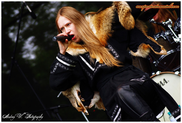 Allons maintenant du côté de la Second Stage où Arkona, groupe Russe en constante progression prépare ses balances. Encore un gros coup de cœur pour ce groupe. Leur Folk/Pagan Metal me fait frissonner, ainsi que la voix de la belle Masha, qui arrive à passer d'une voix gutturale à une voix claire en un rien de temps. C'est avec une grande impatience que j'attendais de les revoir. Masha court, saute, danse dans tout les sens, le guitariste bouge beaucoup plus que le bassiste qui, je trouve, est trop statique. Goi, Rode, Goi est joué, le show est basé avant tout sur le dernier album, ils auront joué quarante minutes et encore une fois ce ne sera pas assez pour rassasier ma soif de ce fabuleux groupe.