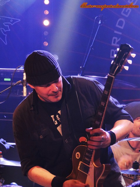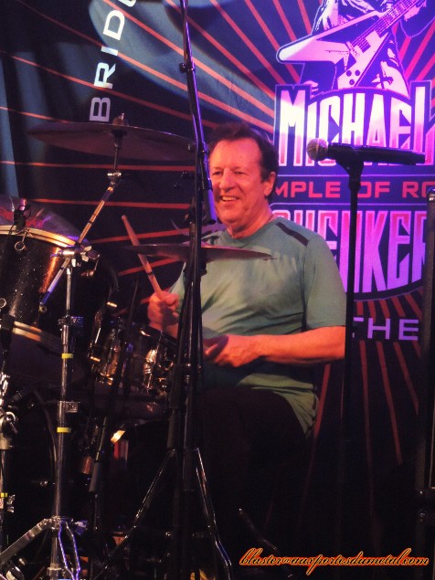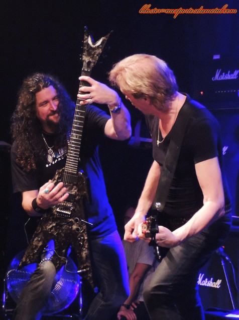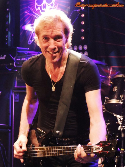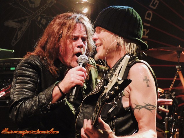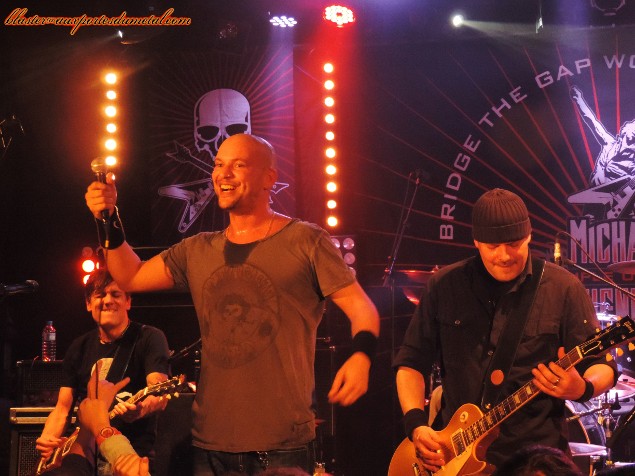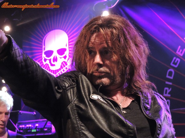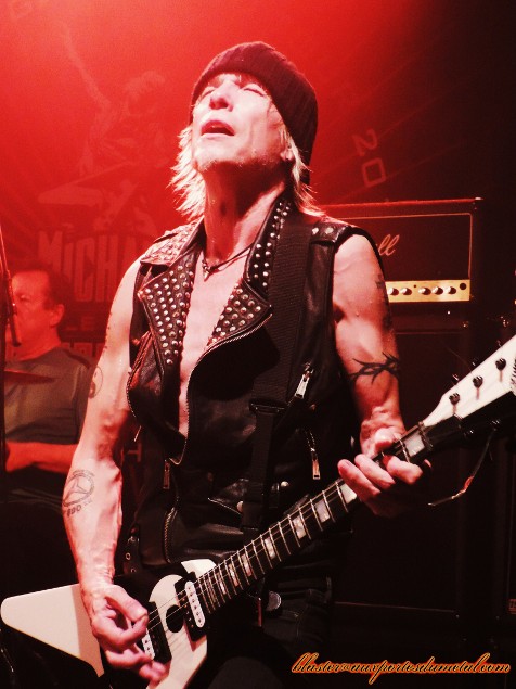 21h40, les lumières s'éteignent pour la deuxième fois. Une intro symphonique retentit dans le forum, Herman "ze German" Rarebell s'installe derrière sa batterie, bientôt suivi par tous les membres de Temple of Rock (le nom de cette nouvelle aventure Schenkeresque pour ceux qui n'ont pas suivi et pensent qu'il s'agit toujours de MSG)... et c'est Wayne Findlay derrière son clavier qu'on entend en premier puisqu'il joue les premières notes d'un classique parmi les classiques du Schenk : Doctor Doctor de UFO. La salle ne s'y trompe pas et l'accueil est à la mesure de la chanson : excellent. Pendant ce premier titre, la fosse se montre enjouée et reprend le refrain en choeur comme un seul homme... et les personnes du premier rang viennent se faire taper dans les mains par un Michael Schenker souriant. On peut dire que ça commence très bien. Le son est très bon, la voix de Doogie White me semble légèrement en retrait mais on entend quand même assez bien le monsieur. Une des premières choses que l'on constate est que le groupe est énergique et rayonnant. Je me souviens que, la dernière fois, White s'était parfois montré assez sombre et renfrogné... agacé par certaines personnes du public qui, d'après lui, prenaient trop de photos du groupe. Ce soir, ce n'est pas du tout la même chose : il est tout sourire et respecte à la lettre le cahier des charges du bon frontman. Enthousiaste, complice avec ses collègues et le public, il chante avec entrain, fait participer les fans, présente les musiciens avec humour... Bref, ce n'est pas le même homme que la dernière fois et c'est très appréciable. Refermons cette parenthèse et revenons-en à la musique. En deuxième position dans la setlist, une chanson du dernier album (le plutôt réussi Bridge The Gap) : Where the Wild Wind Blows. Un début de concert assez différent de celui de 2013 qui avait commencé en mettant en avant les titres de l'ère Scorpions, voulant sans doute accentuer le côté "réunion" de l'entreprise puisque, faut-il le rappeler, nous avions quand même (et avons toujours) trois ex-membres du légendaire combo allemand (Schenker et Rarebell bien sûr... mais aussi le bassiste Francis Buchholz) sur scène. S'ensuit l'imparable Armed And Ready (retour aux années MSG, donc), toujours aussi efficace sur scène... avant que le groupe enchaîne avec deux morceaux qui n'avaient pas été joués l'an dernier, histoire d'éviter de trop se répéter : Natural Thing et Victim Of Illusion. En dépit des nombreuses similtudes entre les différents shows de Schenker, il est bon de constater que quelques efforts sont faits pour ne pas toujours nous proposer exactement la même chose. Bon point. Enfin, pour être tout à fait juste, ce bon point est surtout attribué à ce début de concert car les surprises se feront plus rares par la suite. Premier titre de Scorpions à être joué ce soir : Lovedrive. Prévisible mais ô combien agréable. Pour prolonger le plaisir de ce voyage dans le temps (de trente-cinq ans en arrière), le groupe enchaîne avec l'instrumental Coast to Coast issu du même album... avant de revenir au répertoire plus récent de la bande à Schenker avec Before The Devil Knows You're Dead dédiée au grand Ronnie James Dio. On se souvient que Doogie White avait été très ému (aux larmes) sur ce titre lors de son dernier passage à Vauréal... Ce soir, comme dit plus haut, l'humeur est plus légère et le vocaliste semble moins affecté, il se fend juste d'un petit devil's horns et d'un "Thank you Ronnie!" en fin de morceau. On reste dans la période la plus récente de Schenker avec Lord Of The Lost And Lonely (extraite de Bridge The Gap) avant de repartir pour une alternance de titres des différentes groupes du guitariste (UFO, MSG, Scorpions). Au beau milieu de ce best of, comme la dernière fois, Schenker et ses sbires nous offrent une nouvelle chanson en avant-première. Il s'agit de Vigilante Man, compo qui figurera sur le nouvel opus (Spirit On A Mission) censé débarquer au mois de mars prochain. Pas extraordinaire (peut-être que sa redécouverte sur album me fera changer d'avis) mais ça passe assez bien sur scène... Peut-être aussi que le fait que cette nouvelle compo soit glissée au milieu de classiques tels que Shoot Shoot, Rock Bottom (et son solo à rallonge sur lequel Schenker est impressionnant) ou Rock You Like A Hurricane (quelle ambiance sur celle-là !) n'aide pas... Les morceaux s'enchaînent vite, Doogie White nous explique que le lendemain ils se rendent à un festival au Pays de Galles... Est-ce pour cela que le rythme est si soutenu et que les chansons sont si pêchues ? Par crainte de finir trop tard ? Je n'en sais rien mais ce n'est pas grave (bien au contraire), l'essentiel est que le set est loin d'être plan plan... belle énergie ! Et puis, dix-huit chansons proposées ce soir, ça va, on ne peut pas dire que nous nous fassions arnaquer... la setlist est bien généreuse. Et, encore une fois, je retiendrai les sourires arborés par les musiciens qui semblent vraiment passer un bon moment sur scène. Wayne Findlay prend son pied, Herman Rarebell rit pendant que Doogie le charrie (il se moque de lui en prenant une pose de batteur pépère qui joue d'un air non concerné), Francis Buchholz, détenteur d'un certain flegme, présente une mine réjouie pendant tout le set... Reste Michael Schenker, plus habité et intense mais néanmoins souriant quand il relève la tête. Et il a toujours cette façon si particulière de se déplacer (quasi-constamment arc-bouté et avançant à petits pas, on dirait qu'il souffre d'un lumbago) qui le rend si identifiable. Oui, certes, il y a aussi la Flying V et le bonnet... Une fois le long et épique Rock Bottom magistralement interprété, c'est l'heure des rappels. Le groupe revient une première fois pour nous asséner un excellent Lights Out bien pêchu puis il quitte la scène pour finalement mieux venir nous achever