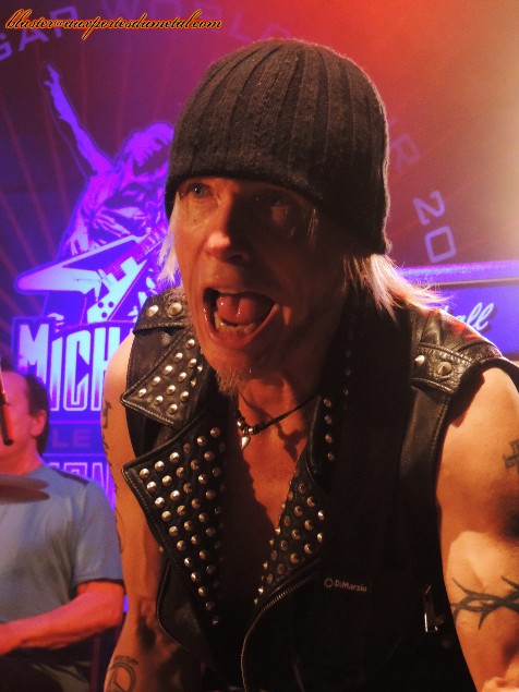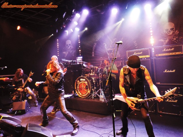 C'est maintenant une tradition : pas une année ne passe sans que Michael Schenker ne nous rende une petite visite. Son lieu de prédilection en région parisienne : le Forum de Vauréal (cette fois-ci, il est cependant également passé par Savigny-Le-Temple) ! Et aujourd'hui encore, pour la troisième fois consécutive (en trois ans) donc, le concert est complet. Il est chez lui le Schenker, tout simplement. Je me demande s'il n'a pas une petite piaule qui lui est réservée en sous-sol... Comme pour tout concert qui se respecte, il faut passer par une première partie. L'expérience est parfois plaisante, parfois moins... Le nom du groupe choisi pour démarrer la soirée ne me dit rien... enfin si... mais il m'évoque plus une marque de café soluble qu'un groupe de metal : Maxxwell. Le premier titre, Partykings, ne laisse pas planer le doute très longtemps quant à l'orientation musicale du groupe : il s'agit de hard rock, certes, mais assez rentre-dedans avec un côté hard/metal US (à la Skid Row) mais saupoudré de petites touches modernes qui ne le destine pas qu'à être uniquement consommé par les nostalgiques des années 90. Avec Fuck it!, le combo confirme un goût prononcé pour un hard rock puissant et nerveux. J'ai beau ne pas connaître les compos sur album, je me laisse facilement entraîné par ce début de set bien sympathique. D'autant plus que le groupe est plutôt à son aise sur scène. Le chanteur, dont le volume capillaire est inversement proportionnel à celui d'un metalleux lambda (oui, il est chauve), est très souriant et arpente la scène de gauche à droite avec une bonne humeur appréciable. Son truc, on le remarque assez vite, c'est de faire tourner son fil de micro tel un lasso, ce qui demande une certaine adresse car la scène n'est pas si grande et un accident est si vite arrivé... Mais non, personne ne sera blessé. Il s'adresse à nous en français, précise que le groupe est suisse, ce qui provoque des cris d'approbation dans l'assistance. "Ah, il y a des fans de la Suisse ?", s'écrit alors le frontman... Non, pas vraiment mec, on est juste un public sympa. Cela dit, on a beau être sympa, nul besoin de se forcer pour apprécier la musique proposée par Maxxwell... surtout quand elle se fait encore plus accessible et mélodique avec Nothing Changes My Mind (dont voici la vidéo, cherchée pour vous, chers lecteurs). Ce genre de rock mélodique passe tout seul sur scène et, sans forcément trouver ça bouleversant, on ne s'ennuie pas une seconde. Avec No Pain No Gain, le hard helvète se montre toujours aussi efficace. Gros riff, mid-tempo bien puissant et refrain idéal pour le live... le chanteur (qui, précisons-le, est bien en voix) fera d'ailleurs participer le public en lui faisant reprendre plusieurs fois le "Feeling alriiiight" du refrain. Puis vient la grosse power ballade rock (un peu dans le style de celles de Skid Row), Gone Forever, que le chanteur introduit en disant qu'elle est pour les jolies filles de France. J'ai beau ne pas correspondre au profil évoqué, je l'écoute quand même... de toute façon, je ne vais pas me barrer maintenant, la soirée est loin d'être finie. Parmi les derniers titres joués, je retiendrai l'énergique Heads or Tails qui propose un tempo rapide, ainsi que la bien heavy Slapshot (allez, je partage encore une fois la vidéo, vous allez voir, c'est très sympa) au refrain fédérateur (si si, c'est fédérateur, j'ai vérifié, ils disent "One for all, all for one"... forcément ça fédère). Tout cela est fait comme il faut, c'est carré, joué dans la bonne humeur (mention spéciale pour les fausses expressions de méchant du batteur de temps à autre), servi par un bassiste assez flegmatique mais néanmoins pro et qui, en plus, porte son foulard comme un pirate... signe infaillible de bon goût, un guitariste qui porte le bonnet mais sait prendre la pose lors de bons solos bien sentis et (on va abréger la liste) un groupe globalement investi et convaincant. Un très bon moment, une bonne découverte, un groupe à suivre. Setlist de Maxxwell : 01. Partykings