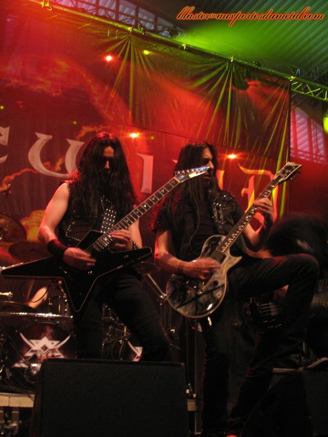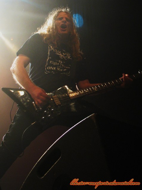 . Circus Maximus (Blaster). Voilà un groupe que j'attendais avec impatience. Sans doute un de ceux que j'avais le plus envie de voir. Cela n'enlève rien aux autres mais disons que les Circus Maximus se font plus rares que certains Firewind, Stratovarius, Gamma Ray ou Helloween pour ne citer qu'eux... Alors évidemment, la rareté entraîne la curiosité. Et puis, Nine, dernier disque des Norvégiens tourne régulièrement dans ma platine depuis sa sortie... quel album ! Verdict en quelques mots ? Classe. Court. Trop court. L'entrée sur scène est risquée puisqu'elle se fait sur un titre long et changeant, l'excellent Architect of Fortune. Certes, la compo est belle, mais je me suis dit qu'il y avait sans doute une chanson plus courte et "efficace" pour captiver le public. Cela dit, ça marche ! On se surprend à rentrer immédiatement dans le concert des Norvégiens. Cela s'appellerait-il le talent ? Certainement. Les titres plus "faciles" arrivent juste derrière avec Namaste et son superbe refrain et quelques morceaux extraits de l'indispensable Isolate comme A Darkened Mind, Abyss ou la plus FM Arrival Of Love. La performance des musiciens est impeccable et se trouve plutôt bien mise en valeur par le son, avec un tout petit bémol en ce qui concerne le volume du micro de Michael Eriksen que j'aurais souhaité plus fort. Setlist Circus Maximus : 01. Architect of Fortune . Firewind (Blaster). Firewind, on le sait bien, est une machine de guerre bien huilée et particulièrement efficace sur scène. Ce fut encore plus vrai ce dimanche avec un tout nouveau venu dans ses rangs : le terrible Kelly Sundown Carpenter. La vache, ce type est un tueur !! On le savait, sur album (avec Beyond Twilight, Outworld, Epysode) mais je ne l'avais jamais vu faire ses preuves en live. C'est chose faite et ce monsieur mériterait bien la palme du meilleur chanteur du festival ! Pour ceux qui ne le connaissent pas, dites-vous qu'il a une voix puissante assez proche de celle de Jorn Lande (qu'il remplaça d'ailleurs au sein de Beyond Twilight il y a quelques années). Le son est bon, le light show également. Le groupe est, comme à son habitude, ultra-carré. Dextérité et mise en place impeccable sont au rendez-vous. Et, je me répète : Firewind n'a jamais eu un aussi bon chanteur sur scène. Ce n'est pas pour dire du mal d'Apollo qui reste un très bon vocaliste mais là, quand même, Kelly déchire tout ! C'est un autre niveau, une toute autre maîtrise... C'est aussi un peu moins chaleureux, c'est vrai... le côté nordique à la Jorn, sans doute (opposé à la chaleur de la Grèce). Les chansons s'enchaînent sans temps mort avec un début particulièrement heavy (Wall of Sound + Head up High + Destination Forever = efficacité maximale). Comme à son habitude, le groupe termine avec son single fétiche extrait de l'album Allegiance, le fameux Falling To Pieces. Chanson très sympathique et mélodique mais à propos de laquelle je me suis toujours demandé ce qu'elle avait de si particulier pour qu'elle serve systématiquement de conclusion au show des Grecs. Bref, aucune importance. Une chose à retenir : un concert de Firewind est toujours un bon moment qui passe vite... et quand il ne dure qu'une quarantaine de minutes, ça passe encore plus vite ! Setlist Firewind : 01. Wall of Sound . Turisas (Fifi). Après le Pirate Metal d'Alestorm, voici, dans un genre différent mais appelant également à des moments festifs, le Battle Metal des Finlandais de Turisas. Arborant comme toujours ces maquillages rouge et noirs impressionnants, le combo se livre à une prestation de haute tenue, rehaussée par la puissance du son (j'avais une légère appréhension pour le violon, instrument important au sein du combo, mais elle fut rapidement balayée, celui-ci étant au même niveau que les autres) et la qualité du light show. L'humour est également de la partie, quand Mathias Nygård (chant) se lance dans un discours lié à la bière. Bon, ce fut peut-être un peu trop long, une chanson supplémentaire aurait sans doute pu être interprétée en abrégeant... mais bon, je chipote là, le show ayant été génial ! . Gamma Ray (Fifi). Place à Gamma Ray, qui interprète dix compositions que je trouve bien choisies puisqu'on y trouve des morceaux naturellement connus, accrocheurs, piochés au sein de la féconde discographie du groupe, une excellente reprise du Future World d'Helloween et surtout deux nouvelles compositions, à la teneur profondément différente. Ainsi, Master of Confusion s'avère-t-il un morceau sympa mais très classique et en ce qui concerne Empire of the Undead, c'est pour moi LA surprise puisqu'il constitue un titre agressif et rapide, qui fait plaisir puisque ça fait bien longtemps qu'on n'en avait pas eu un de cet acabit !