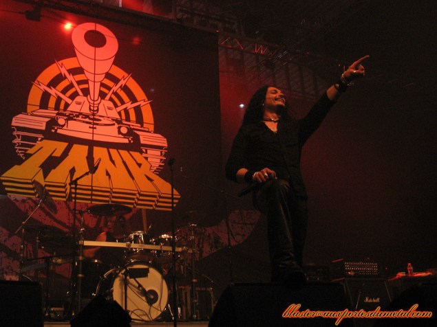 . Nightmare (Blaster). La présence des français de Nightmare sur cette affiche fait bien plaisir. Les Grenoblois maîtrisent l'art de la scène et le dernier album, The Burden Of God, m'a vraiment convaincu. D'ailleurs, il fallait mieux l'aimer ce jour-là le Burden Of God : six chansons sur huit provenaient de l'opus en question. Soit, elles sont bonnes ces compos, mais j'ai trouvé un peu dommage que la setlist de fasse pas preuve d'un peu plus de variété. Seuls les deux derniers albums du groupe furent présentés. A part cela, c'est décidément récurrant, la scène Alpha a un son et des lumières un peu moins sympas que la scène Omega. La prestation du groupe n'en est pas râtée pour autant, évidemment, mais je le remarque tout de même. Dommage. A part cela, les vétérans de Nightmare connaissent bien leur boulot. Jo Amore est vraiment un chanteur convaincant et il a toujours son petit côté Dio qui séduit les fans de la vieille école (dont je fais partie). Tout le groupe est en place. Yves Campion est un bassiste énergique qui a une bonne présence sur scène. Les guitaristes ne sont pas excessivement démonstratifs mais font preuve d'une belle aisance. Le rendu global est convaincant, particulièrement heavy et je me réjouis de revoir ces Français en première partie de Circle II Circle à la fin du mois de mai. Regardez s'il n'y a pas une date près de chez vous (cette tournée compte, pour une fois, plusieurs dates en France) ! Setlist Nightmare : 01. Sunrise in Hell . Tank (Fifi). C'est au tout de Tank (à ne pas confondre avec T.A.N.K, groupe français de Death Melodique), d'investir la scène Oméga. Ce combo anglais, fondé en 1980 et auteur de huit album, nous propose un Heavy Metal traditionnel, exempt d'originalité mais qui m'a plutôt convaincu, happé par la bonne humeur ambiante et communicative, ainsi que par la qualité de l'interprétation. Le chanteur, actuellement, n'est autre que ZP Theart (ex-Dragonforce). On le sent très impliqué, à l'aise et en voix, il communique avec le public, quelques moments de rigolade s'invitent (ah, cette fermeture éclair récalcitrante !). Et bien c'est un groupe de plus que je découvre et qui m'a fait passer un moment très sympa !